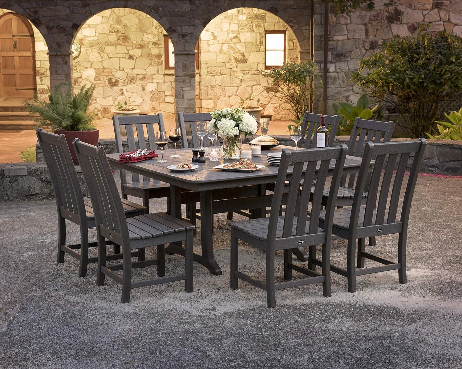 You notice scale first: the Polywood Heavy Duty HDPE Dining Set Vineyard 9-Piece Dinette Set, Slate Grey settles into the room with a quiet, substantial presence. Call it the Vineyard set — the slate-grey softens in late light,more chalk than sheen. You pull a chair out and feel a modest heft; the arched back tucks into your shoulder and the contoured seat is smooth, with a slightly waxy HDPE texture under your hand. From a few feet away the wide tabletop reads solid and unadorned; up close the molded grain and neat joins give it a lived-in, everyday character. It occupies the space without demanding it,the kind of piece you notice more in use than on first glance.