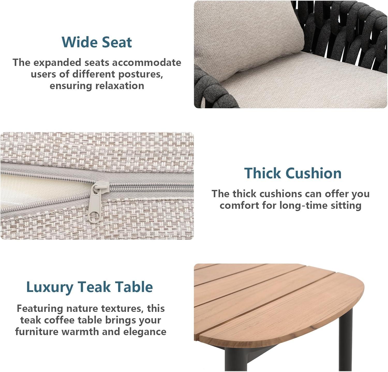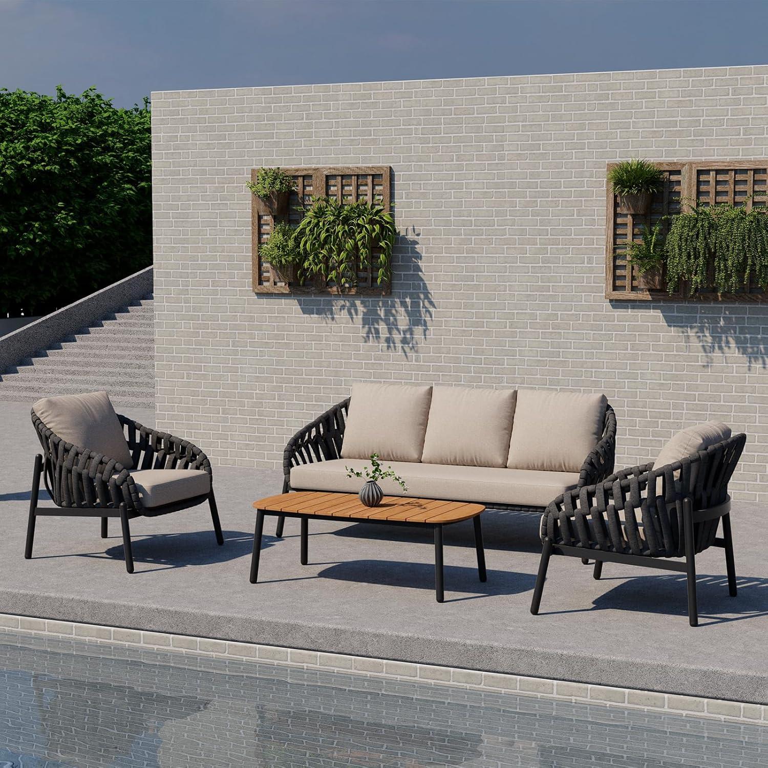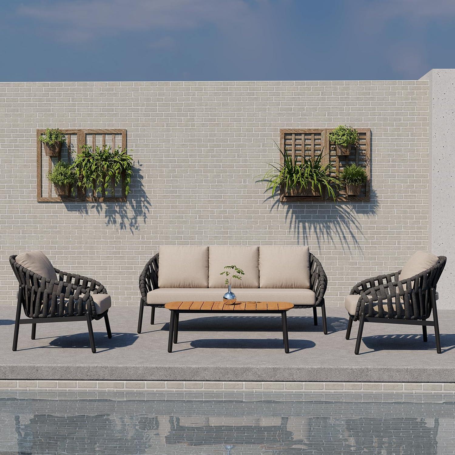 This set strikes a fine balance between style, comfort, and functionality, making it a smart choice for anyone seeking to elevate their outdoor living space. The combination of powder-coated aluminum and woven polyester ropes lends it a modern yet cozy look, perfect for both contemporary and classic garden settings. We appreciate the wide, supportive seats with thick cushions that make long outdoor lounging truly relaxing.Plus, the teak-slatted coffee table adds a warm, natural element to complement the sleek sofas. Maintenance is hassle-free, thanks to the weather-resistant materials and easy-to-clean cushions, so it holds up well through different seasons without demanding much effort.