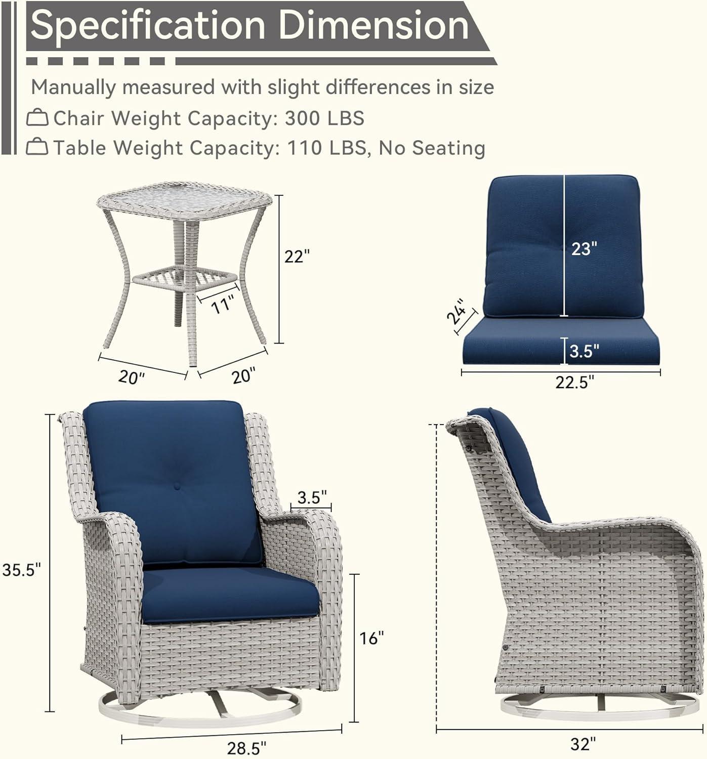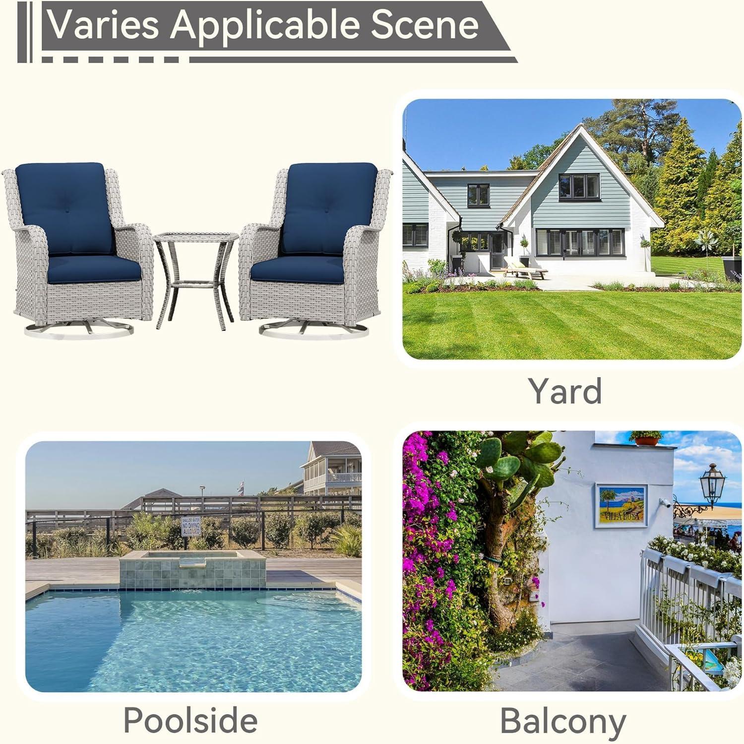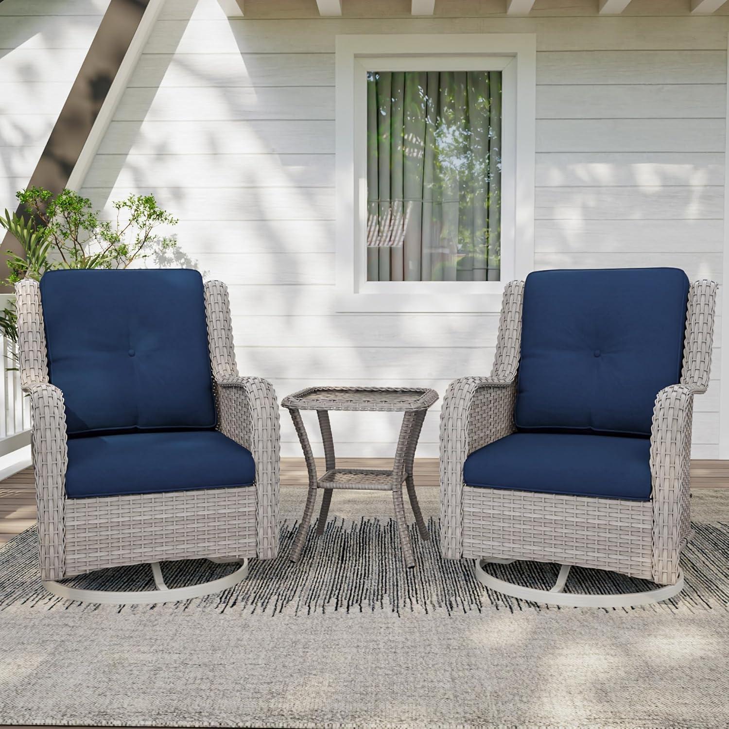 After spending time with this outdoor furniture set, we find it to be a well-balanced combination of comfort, style, and functionality. The 360° swivel gliding feature adds a delightful motion that enhances relaxation, making it perfect for unwinding on the porch or in the yard. the ergonomic design with thick, supportive cushions notably reduces lumbar strain, which is a big plus for long lounging sessions. Plus, the sturdy frame feels durable enough to withstand regular outdoor use, promising longevity through changing weather conditions.
