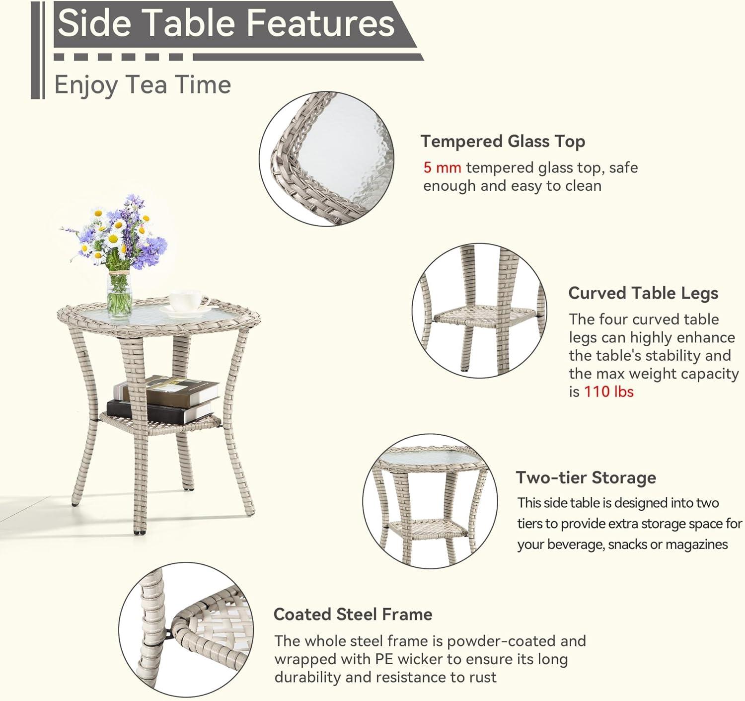the durable dark blue and beige wicker rattan frame not only lends a stylish, contemporary vibe but also withstands daily outdoor wear and tear with impressive resilience. Maintenance is equally effortless; just a quick wipe down with a damp cloth keeps the cushions looking fresh. And, with the included side table sized perfectly to hold drinks or books, convenience is never far from reach. Here’s a quick glance at the chair’s key features: