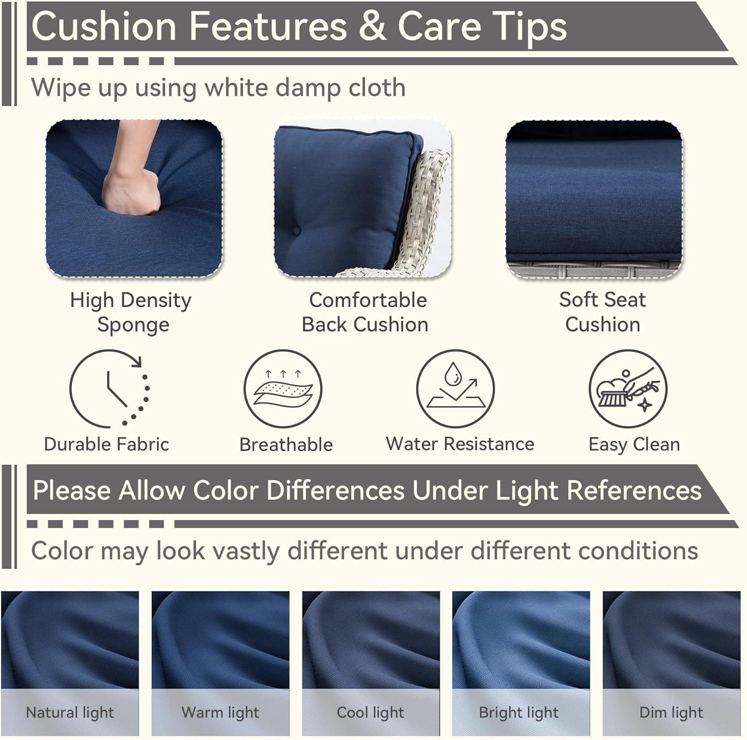 To keep the furniture looking fresh and comfortable, regular cleaning is key. we found that wiping the cushions with a white damp cloth effectively removes most dirt and dust without risking damage to the fabric. Avoid using harsh chemicals or abrasive scrubbers, as they can degrade the beige wicker rattan finish over time. Additionally, because sunlight and ambient light can slightly alter the color perception of the cushions, storing them under shade or covering when not in use helps maintain their vibrant tones longer.