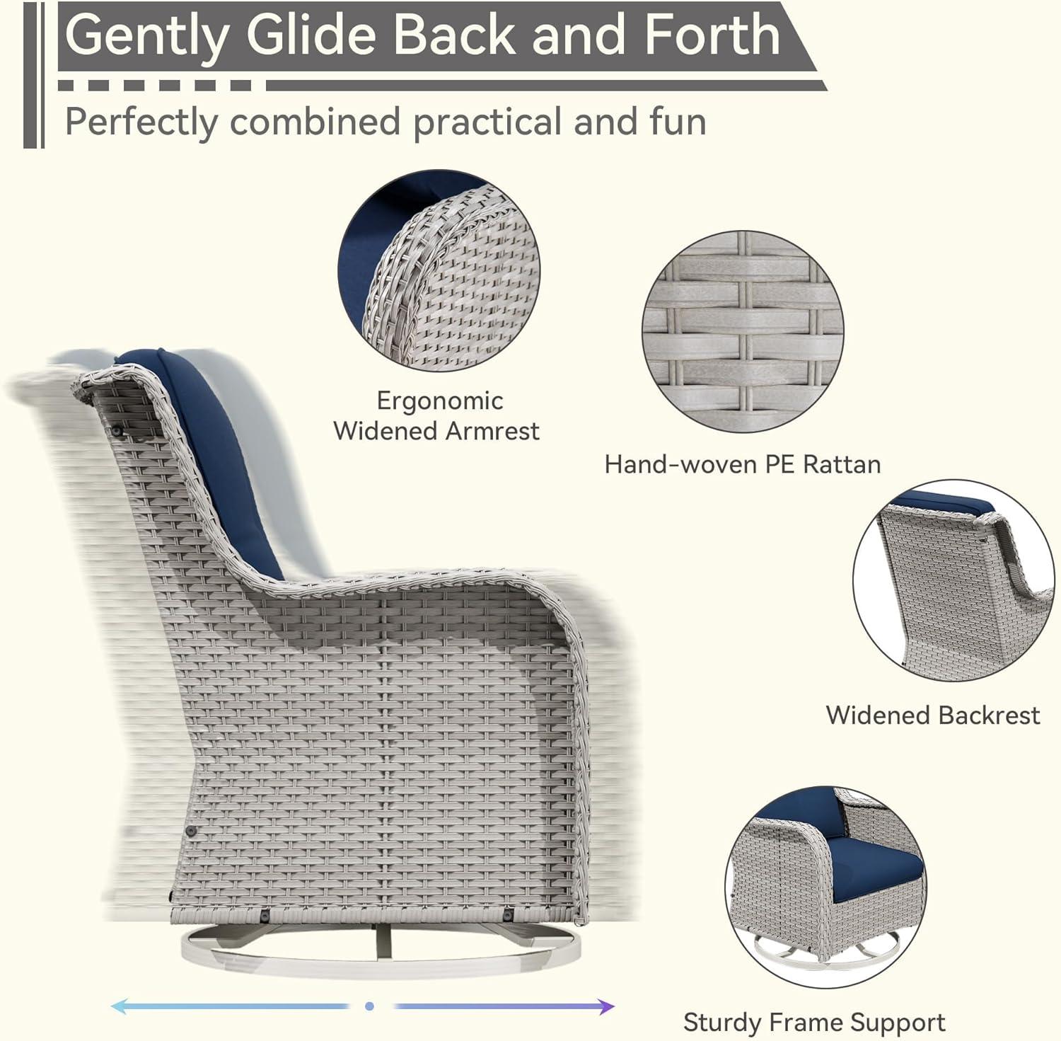 | 360° Swivel gliding Chairs: The smooth, bi-directional rotation adds a playful yet practical touch, letting us gently rock or spin while relaxing. | Limited Color Options: The dark blue and beige wicker combo is classy, but those seeking bolder colors or patterns might find the choices limited. |