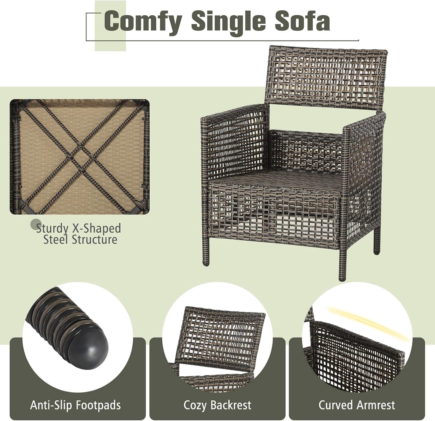 - 【Complete 3-Piece Outdoor Seating Set】This stylish patio furniture set includes 2 single sofas and 1 coffee table, perfect for creating a cozy seating area in your garden, balcony or sunroom. The 5 mm round rattan weave and tempered glass table top combine durability with contemporary design.