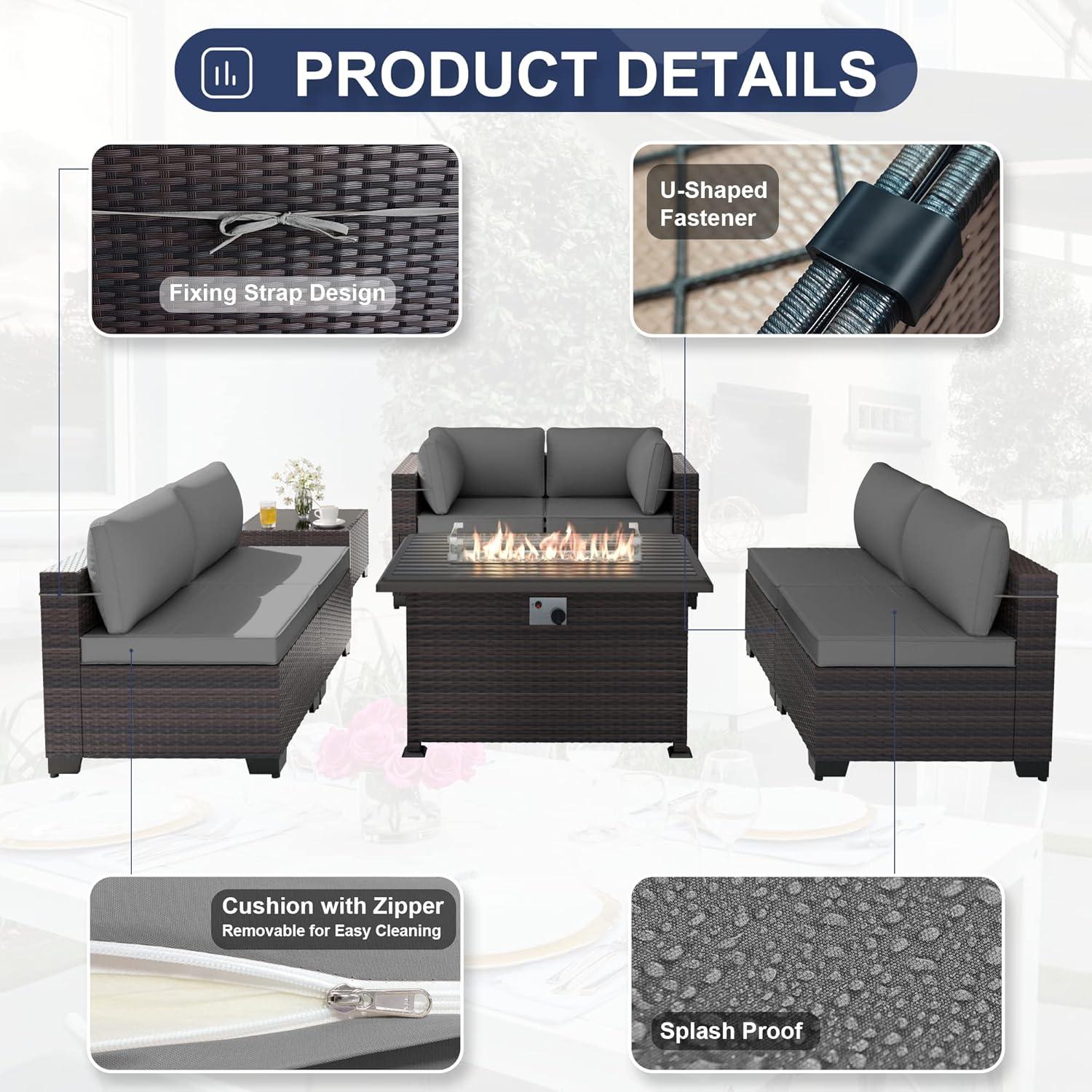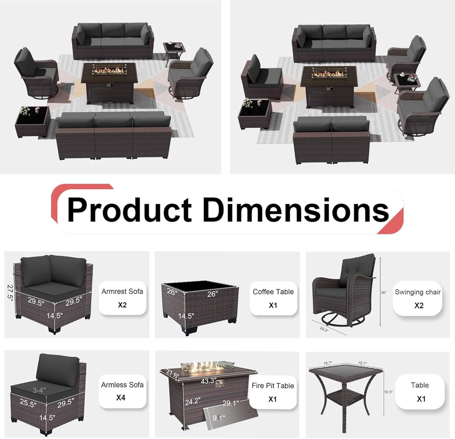 This 11-piece outdoor sectional truly shines in combining comfort,functionality,and style for any patio space. Its swivel and rocking chairs offer a relaxing experience that’s perfect for social gatherings or quiet afternoons,while the propane fire pit adds warmth and ambiance along with a practical outdoor dining surface. The high-quality rattan material paired with thick,soft cushions designed with zippers and non-slip Velcro ensures durability and easy maintenance. Plus, the wider armrests and ergonomic design show thoughtful consideration for long-lasting comfort.