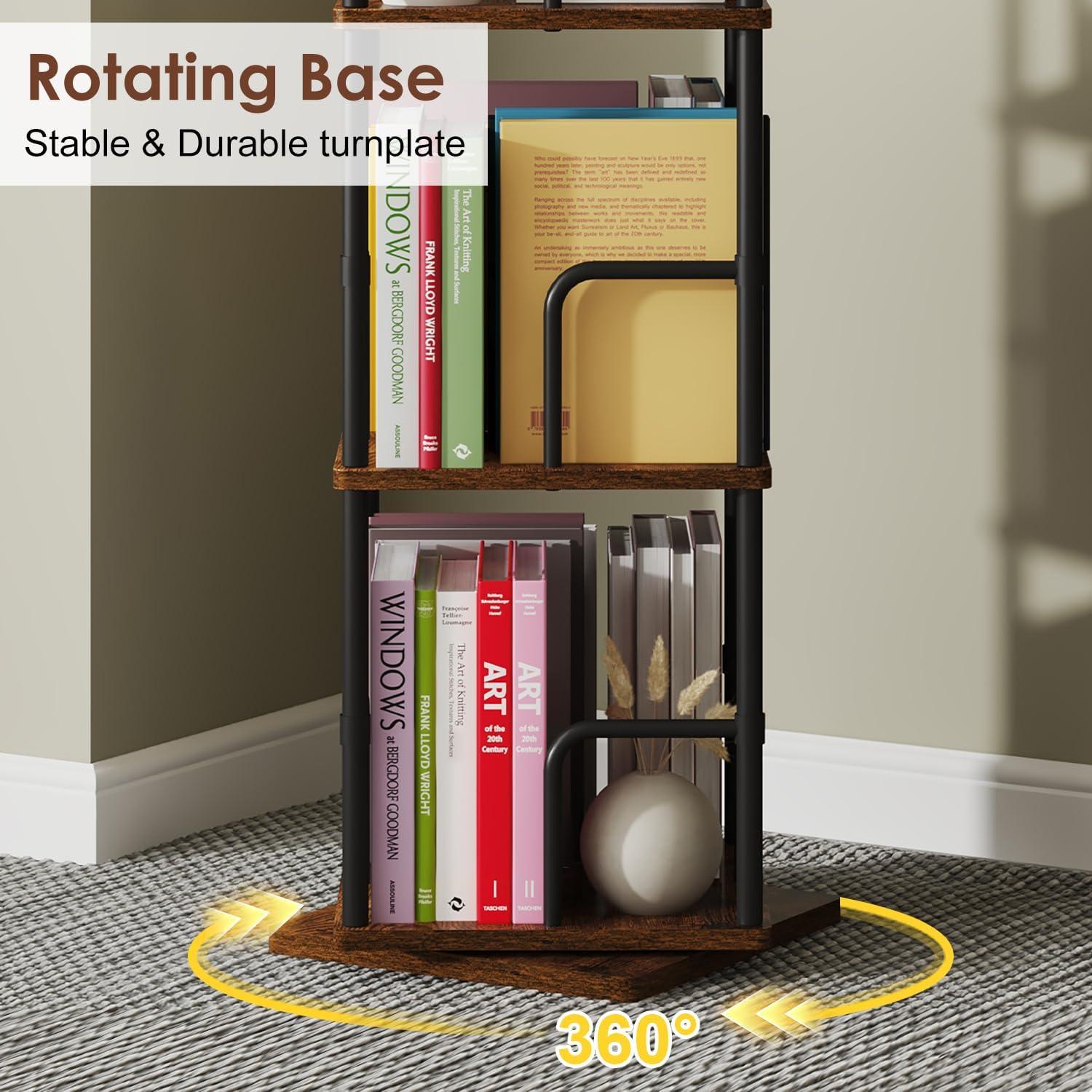 Placed into a corner, the unit reads as a vertical anchor rather than a sprawling piece; it tends to free up central floor space while bringing multiple shelves within a single glance. The rotating tiers present different faces as they turn, so frequently handled volumes move forward with a twist and less lateral reaching is observed. When browsing, the rotation changes how items are reached: a quick turn delivers a new face, and a habit of nudging the shelf into alignment develops over time.