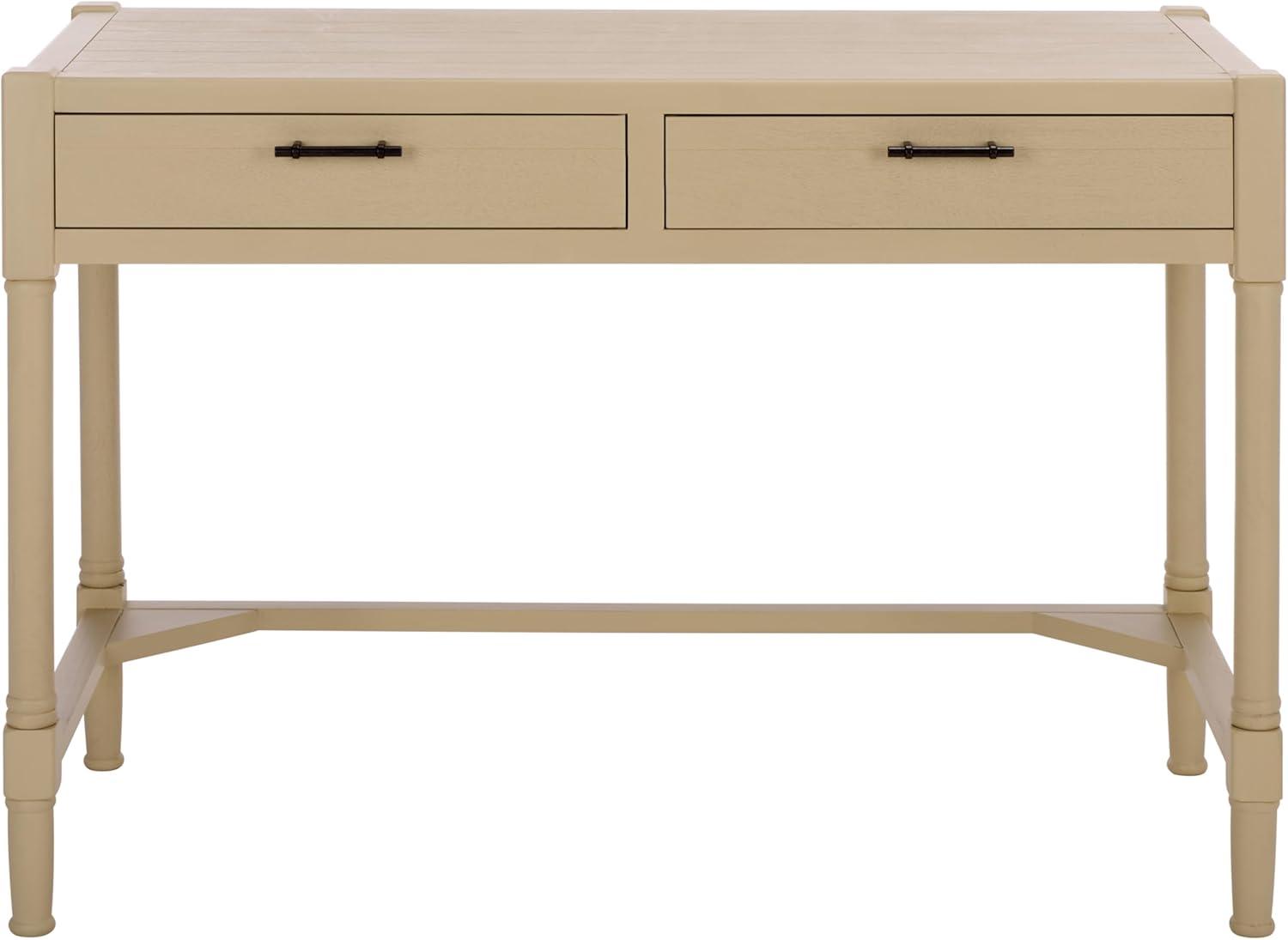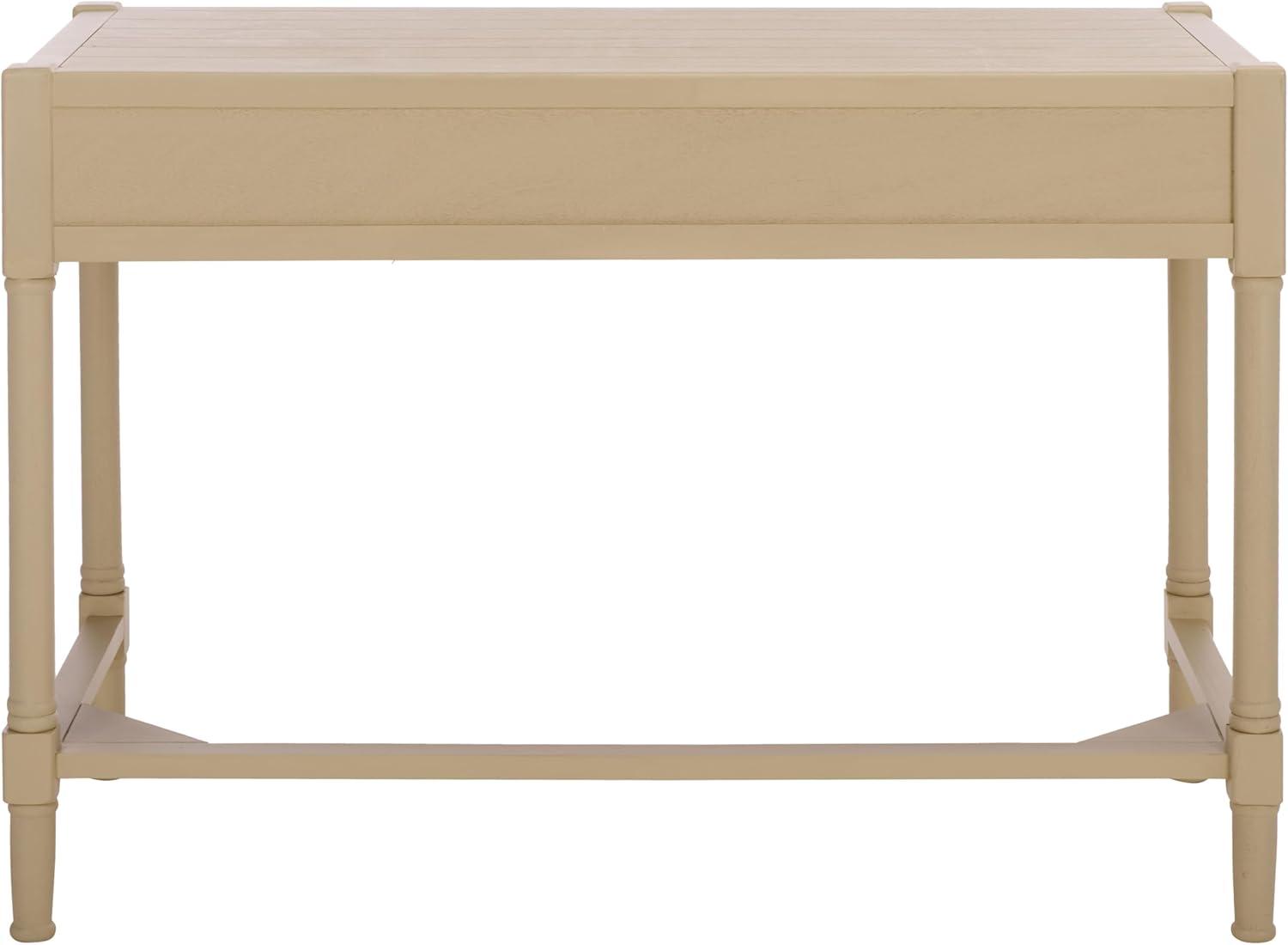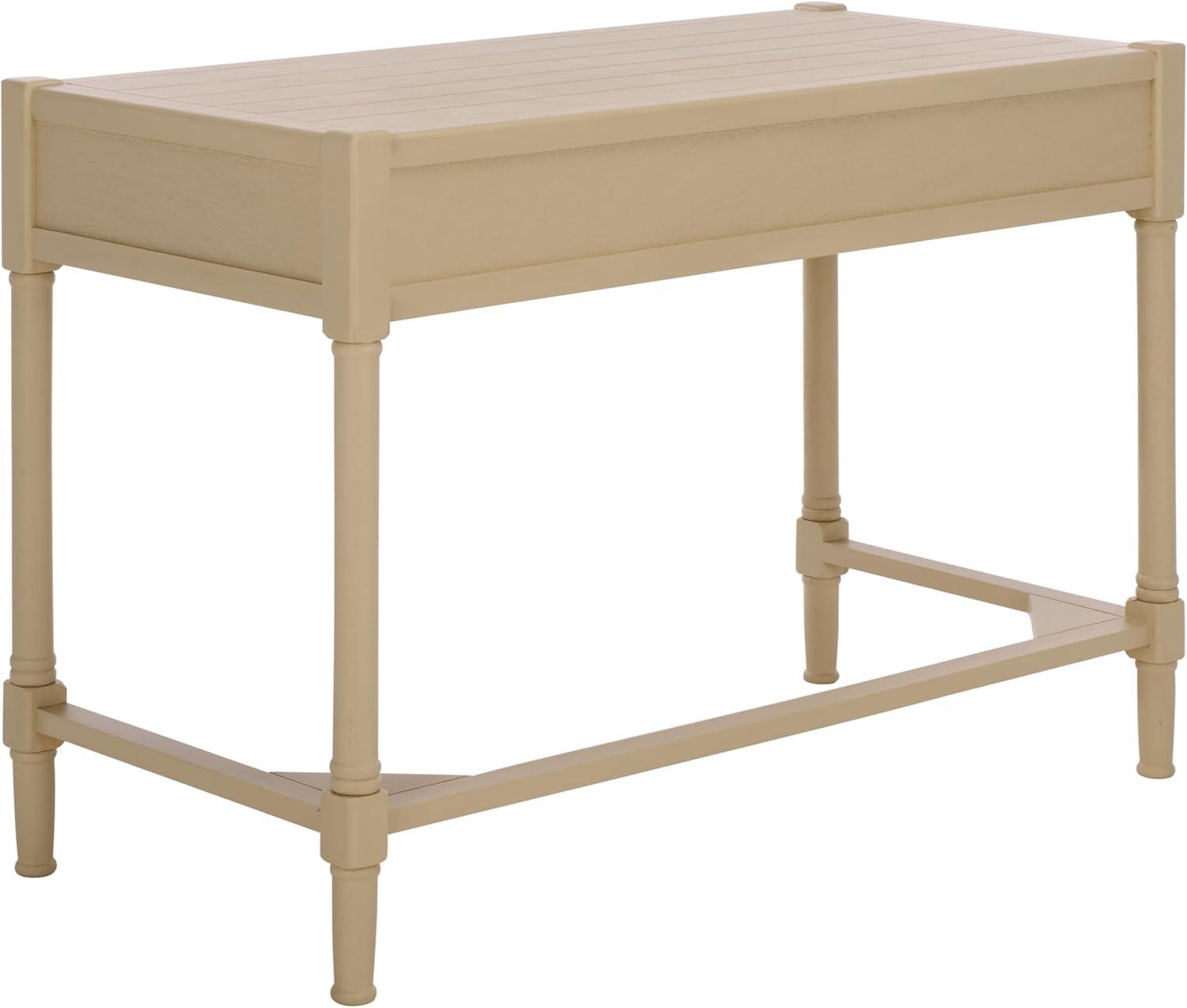 Light pools on the sand-toned top and you first notice the carved apron—a small, traditional flourish that softens the otherwise open silhouette. It’s the SAFAVIEH Filbert Sand Writing Desk, though around your place you’ll probably just call it the Filbert.Running your hand along the surface, the finish feels smooth with a faint wood grain under your fingertips; the carved trim adds a slight texture where your palm catches it. From where you sit the piece has a modest visual weight—enough to read as furniture without closing the space—and the two shallow drawers glide quietly, keeping bits and paper within reach rather than buried. Overall it settles into the room with a familiar, quietly classical presence that you notice more in use than at first glance.