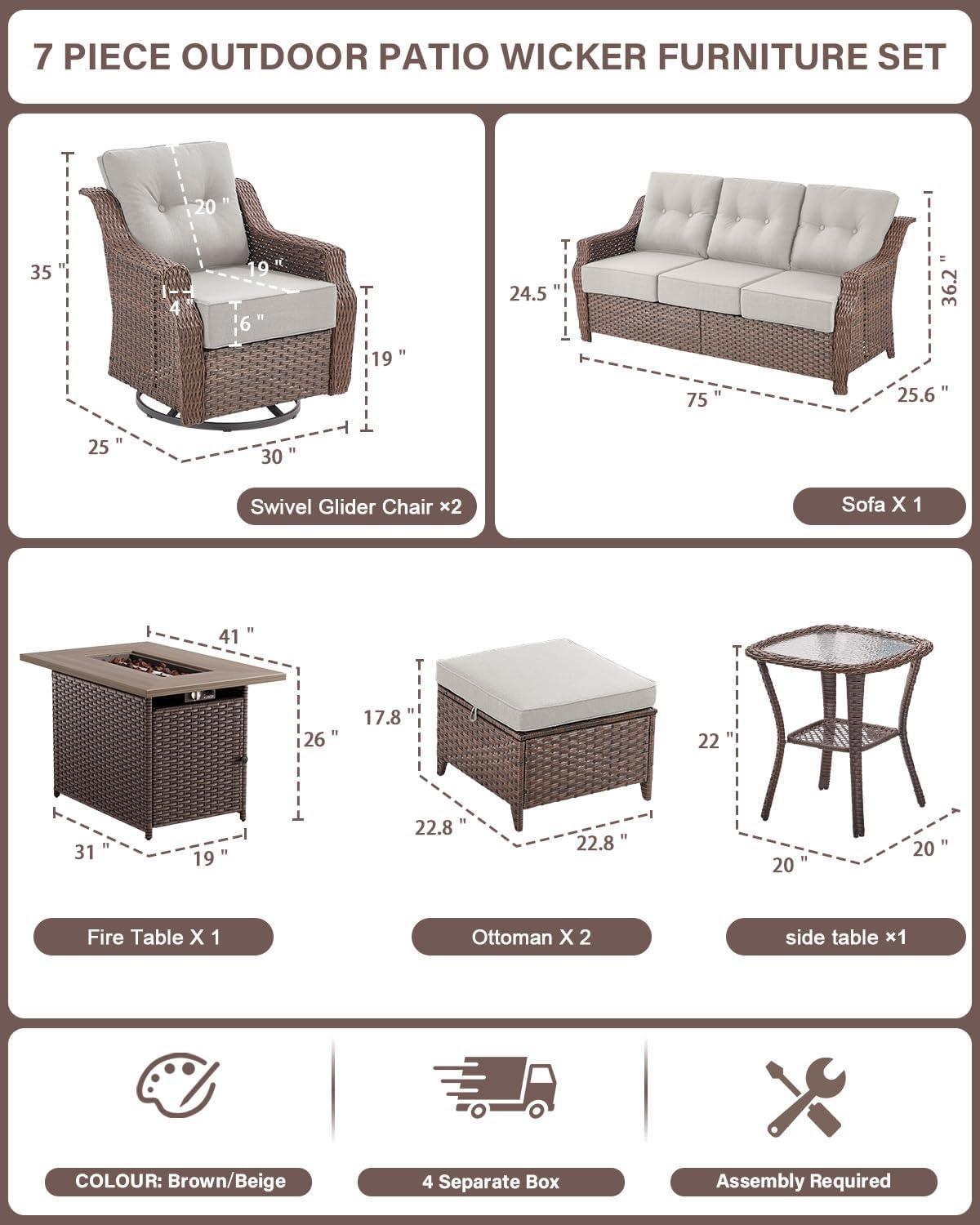 Setting up this 7-piece patio set is straightforward and hassle-free, thanks to the clear instructions and included ratchet screwdriver. We found it easiest to start by assembling the swivel rocker glider chairs, which come with smooth 360° rotation and a gentle rocking motion-ideal for creating a dynamic seating cluster. next, placing the sofa centrally anchors the arrangement, while the two ottomans offer flexible footrests or extra seating.The two side tables conveniently flank either end, providing surfaces for drinks or snacks. The highlight is the propane fire pit table,which acts as both a warm gathering spot and visual centerpiece,perfect for evenings spent outdoors. To ensure longevity, we recommend positioning the set under a covered patio or using furniture covers during harsh weather, as the wicker and cushions are designed to resist fading and moisture but benefit from some protection.