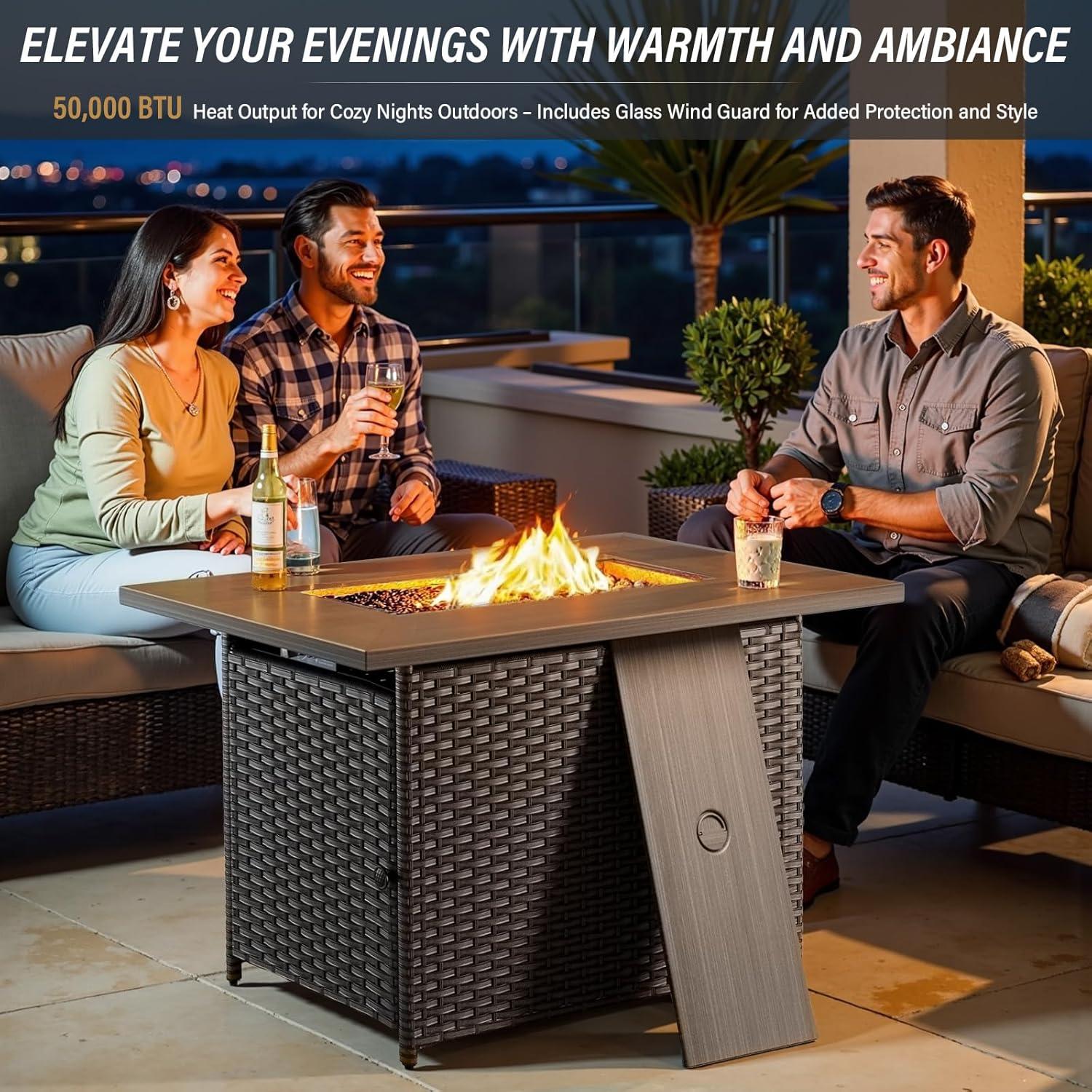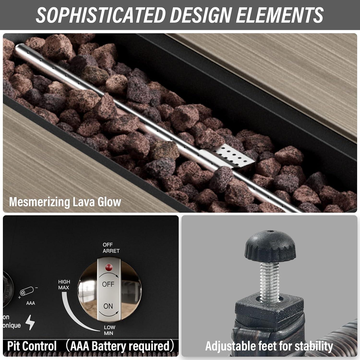 | Stylish Fire Pit Table: The 41-inch propane fire pit offers up to 50,000 BTU heat, creating ambiance and warmth for crisp evenings. | Propane Dependency: Running the fire pit requires propane, so you will need to keep fuel stocked and handle related safety precautions. |