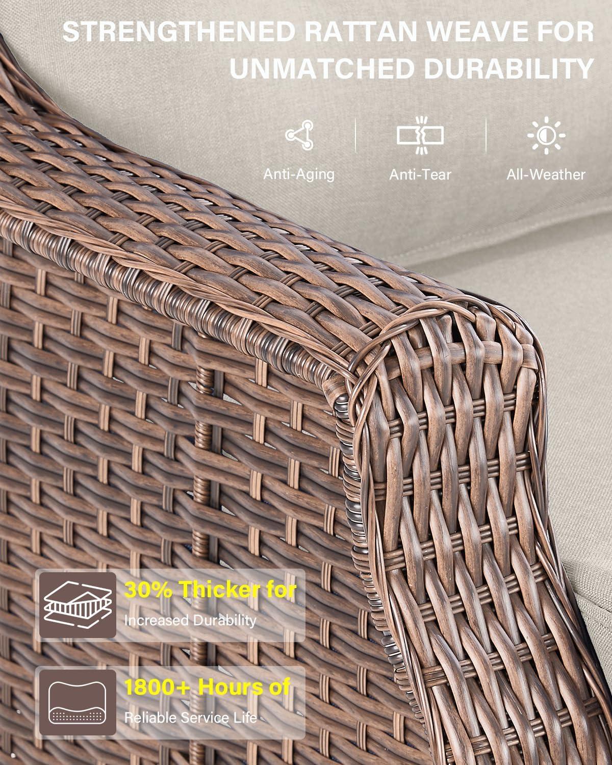 | Versatile Seating Options: Includes swivel rocker glider chairs, ottomans, sofa, and side tables – perfect for customizing your outdoor conversation setup. | weight Considerations: the sturdy steel & wicker framework makes the furniture a bit heavy, which could be cumbersome to rearrange frequently. |