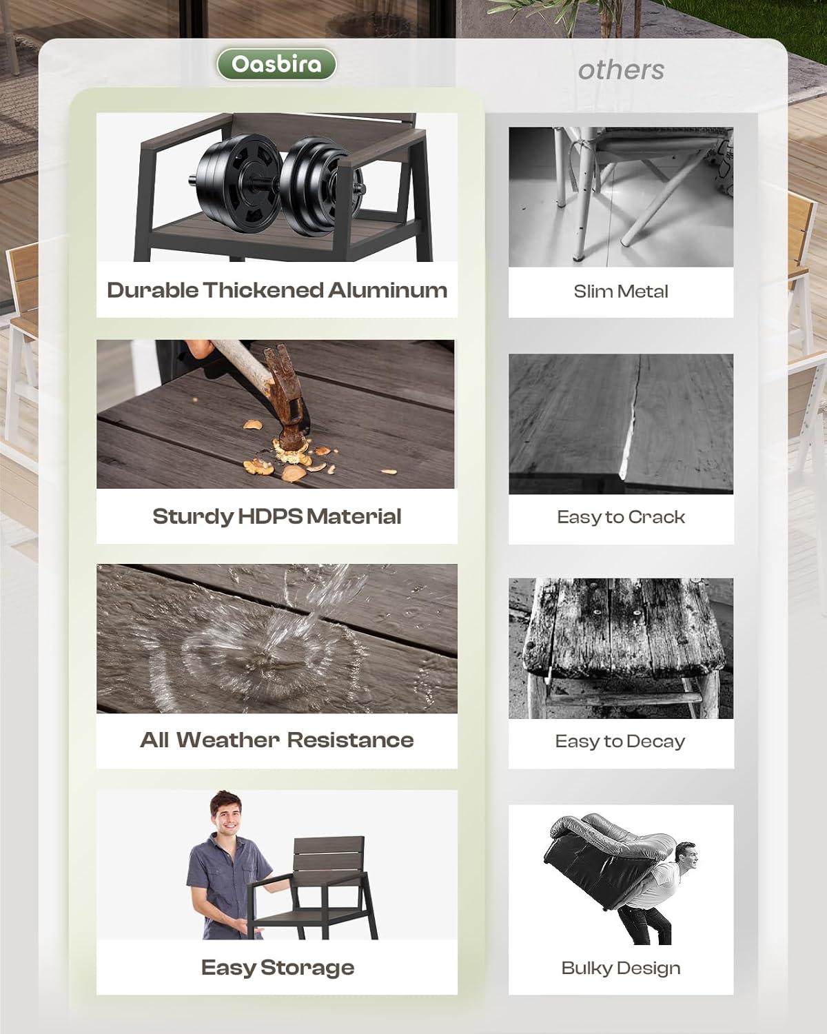 this outdoor dining set strikes an excellent balance between durability, comfort, and style. Its lightweight aluminum frame combined with HDPS wood-like surfaces offers a weather-resistant, fade-proof option that stays cool to the touch, unlike traditional metal furniture. The thoughtful design-including a spacious table with a built-in umbrella hole and chairs supporting up to 350 lbs-makes it perfect for relaxed alfresco dining throughout the year. Maintenance is virtually hassle-free, requiring only a quick wipe-down to keep everything looking fresh and inviting. Assembly is straightforward,and the complete 24/7 customer support adds peace of mind for first-time outdoor furniture buyers.