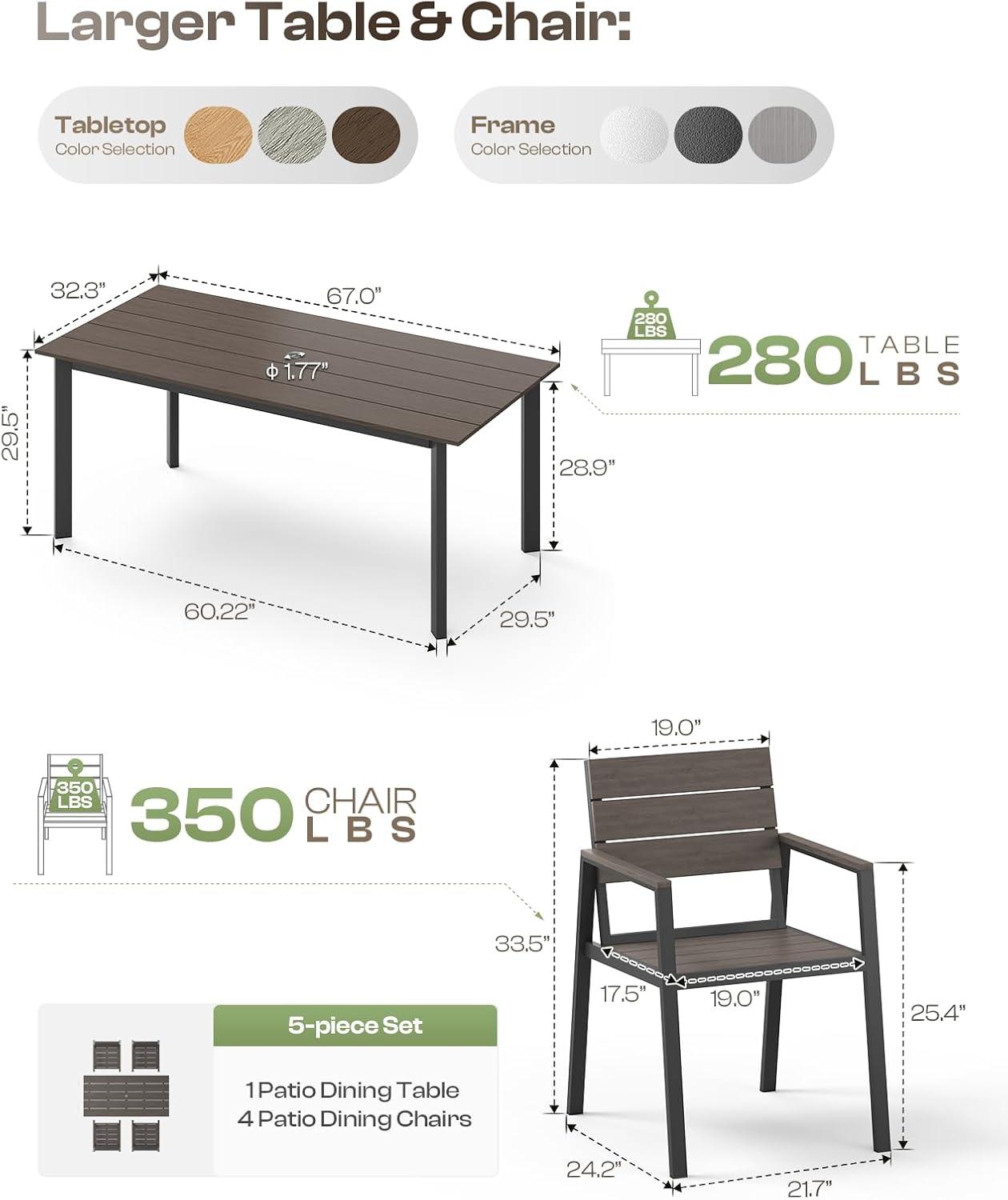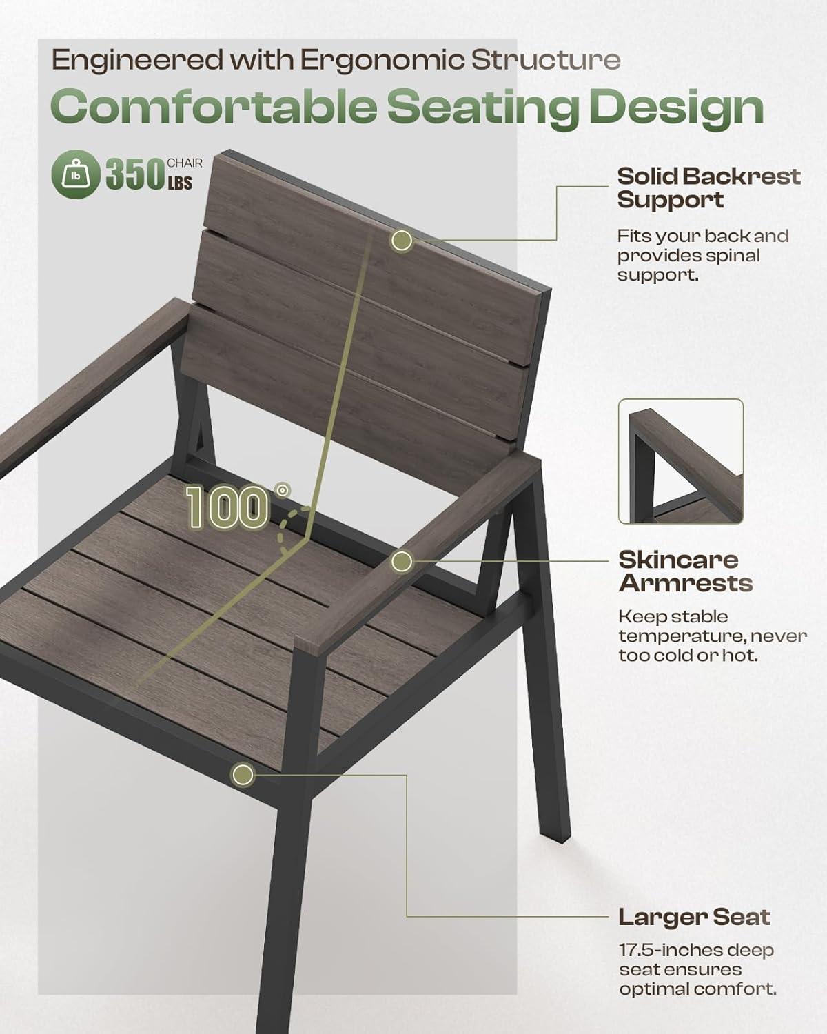 the dining chairs provide a surprising amount of comfort with dimensions of 19″ W and 17.5″ D, comfortably supporting up to 350 lbs. Thanks to the skin-friendly HDPS surface, the seats maintain a pleasant temperature in all seasons, unlike conventional metal chairs that absorb heat or cold. The spacious table complements the set perfectly with its ability to hold up to 280 lbs, making it ideal for both casual meals and lively gatherings.The 1.77″ umbrella hole adds a practical touch, providing an effortless way to add shade and enhance comfort during sunny days.