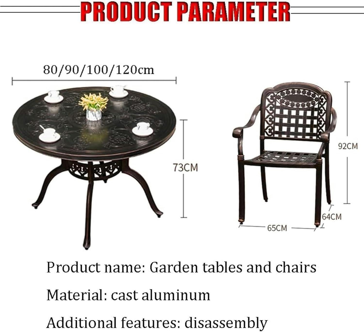 To preserve the fresh appearance and longevity of our set, regular cleaning with a soft duster cloth is essential. Thanks to its cast aluminum frame and weather-resistant finish,it resists sun damage and water exposure,making maintenance simple and hassle-free. We recommend gently wiping down the surfaces after use, especially if exposed to rain or dust, to avoid buildup that could dull the elegant finish. Avoid abrasive cleaners or harsh chemicals to maintain the smooth texture and intricate detail of the 3D carved tabletop.