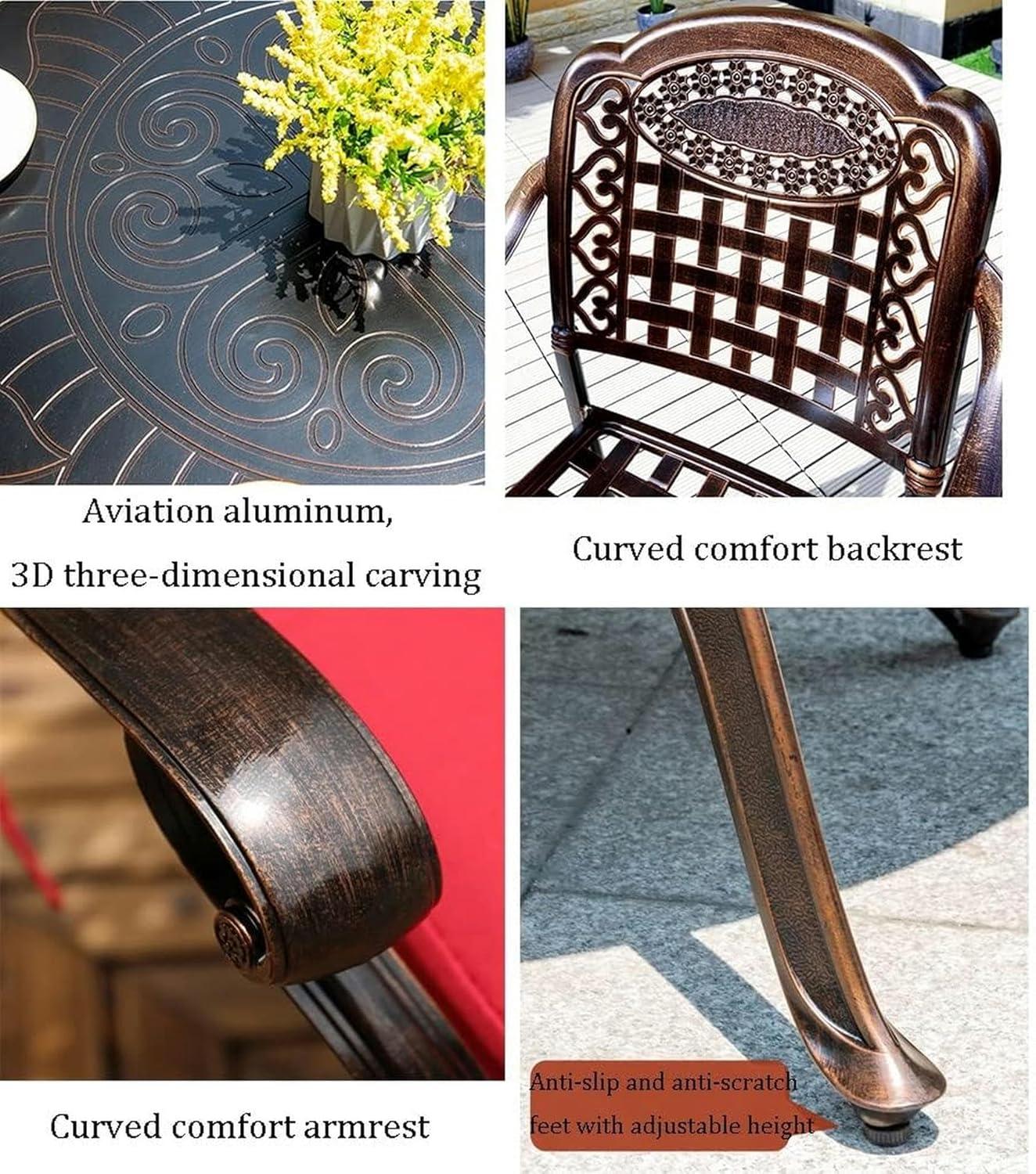 Constructed from high-quality cast aluminum with an aviation-grade finish, this dining set stands out in durability and weather resistance. The metal frame is inherently waterproof,effectively preventing rust or corrosion even after prolonged exposure to rain or moisture. Whether placed on a sun-drenched terrace, by the poolside, or in a shady garden nook, the materials ensure long-lasting protection against the elements. The adjustable foot pads on the chairs add a practical touch,preventing floor scratches and providing stability on uneven outdoor surfaces,while also reducing noise and wear.