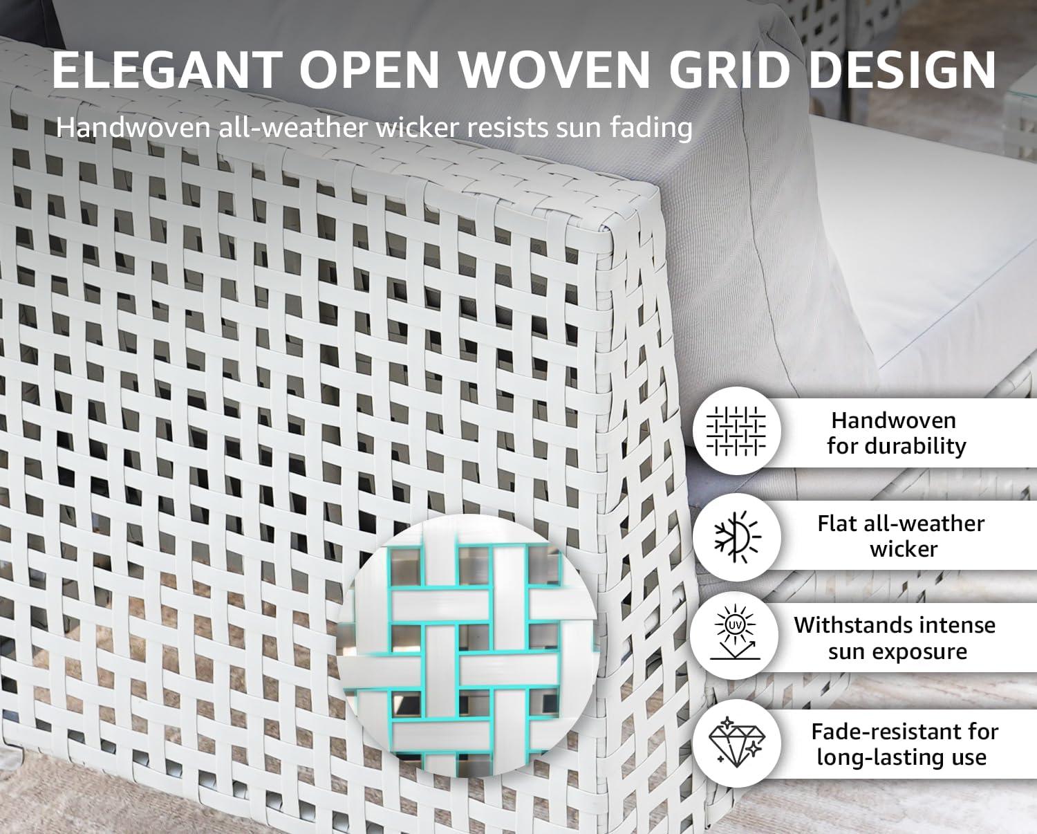This outdoor seating set impresses with its blend of style, comfort, and durability. The deep seats and ergonomic 110° reclining backrests make it ideal for leisurely afternoons, while the high-resilience cushions and weather-resistant materials promise lasting enjoyment nonetheless of the elements. The elegant open weave rattan and sleek tempered glass side table add a modern sophistication that fits effortlessly into any outdoor decor. Assembly is straightforward, allowing two people to set it up in about half an hour, which is a great plus for anyone wanting to avoid complicated furniture builds.