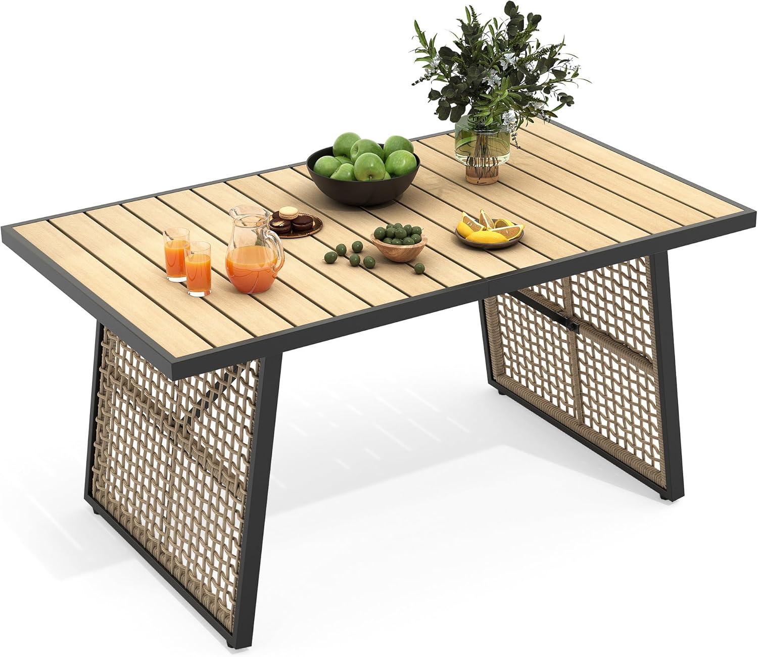 Tangkula 63" Outdoor Dining Table, 4-6 People Rectangular Patio Table with Acacia Wood Slatted Tabletop, 1.97" Umbrella Hole & PE Rattan Legs, Farmhouse Bistro Dinette Furniture for Backyard