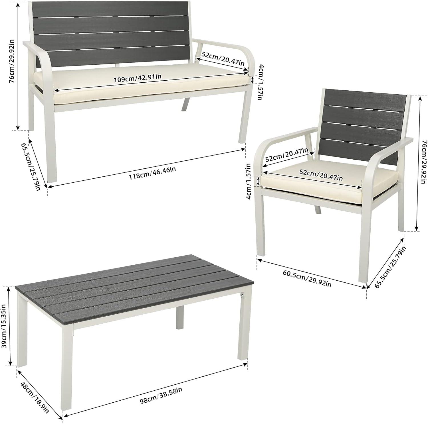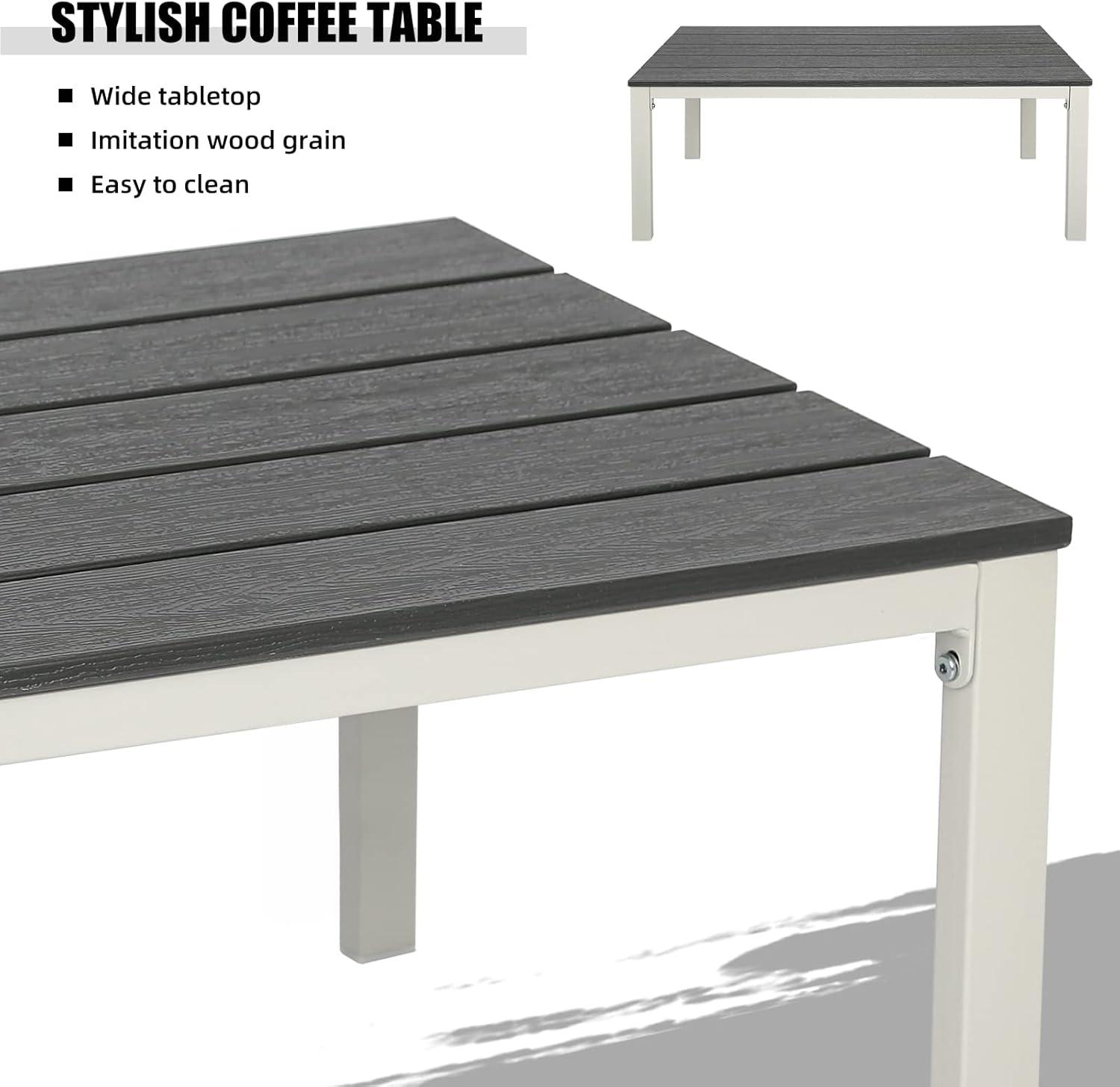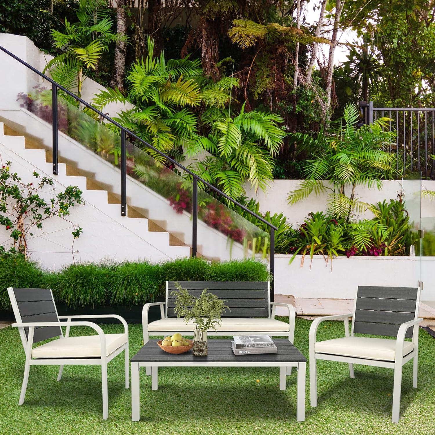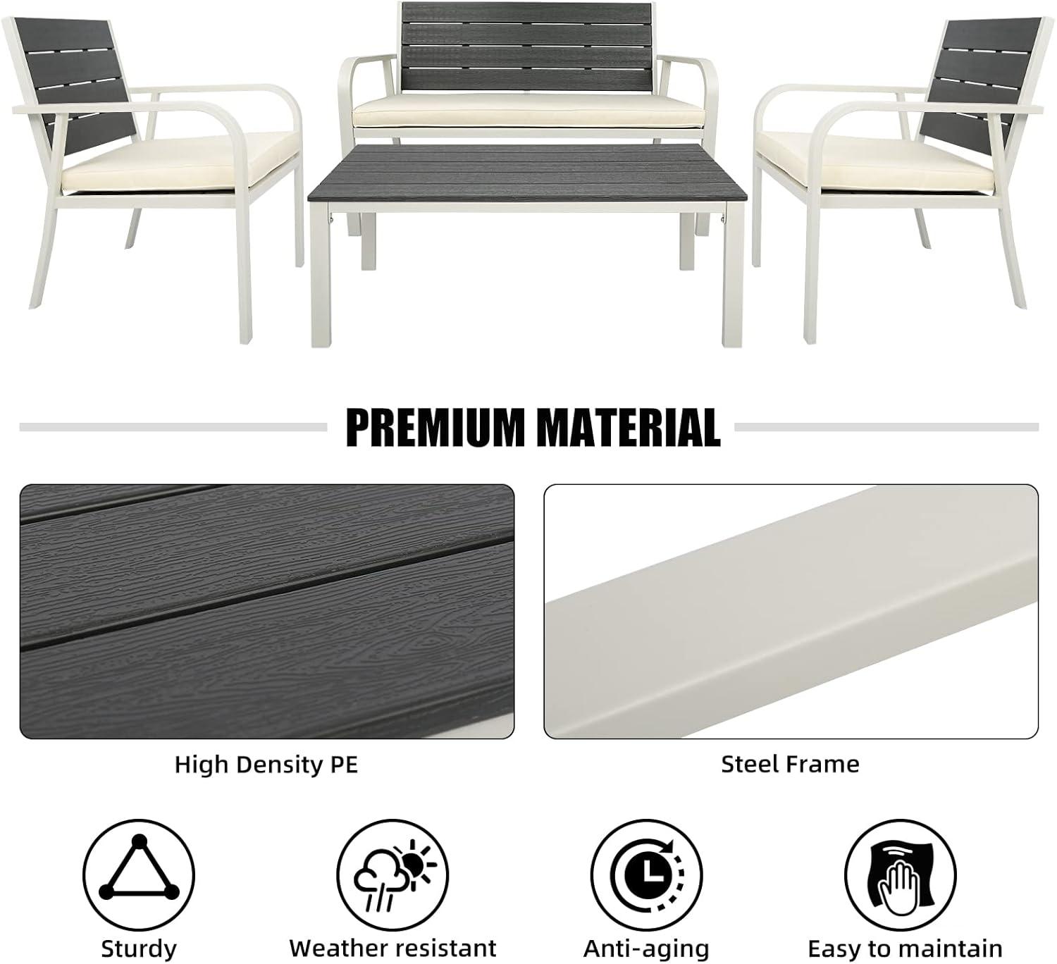 We appreciate how this outdoor set flawlessly combines practical features with an elegant appearance. Crafted with a sturdy PE steel frame, it mimics the warm appeal of traditional wood while offering superior durability against UV rays, water, heat, and cold. This resilience means it withstands year-round exposure without losing its charm or stability. The inclusion of two armchairs, a loveseat, and a coffee table makes it perfect for intimate gatherings, whether on the porch, beside the pool, or out in the garden.Each piece fosters a cozy atmosphere where up to four people can comfortably linger, sip coffee, or share conversations.