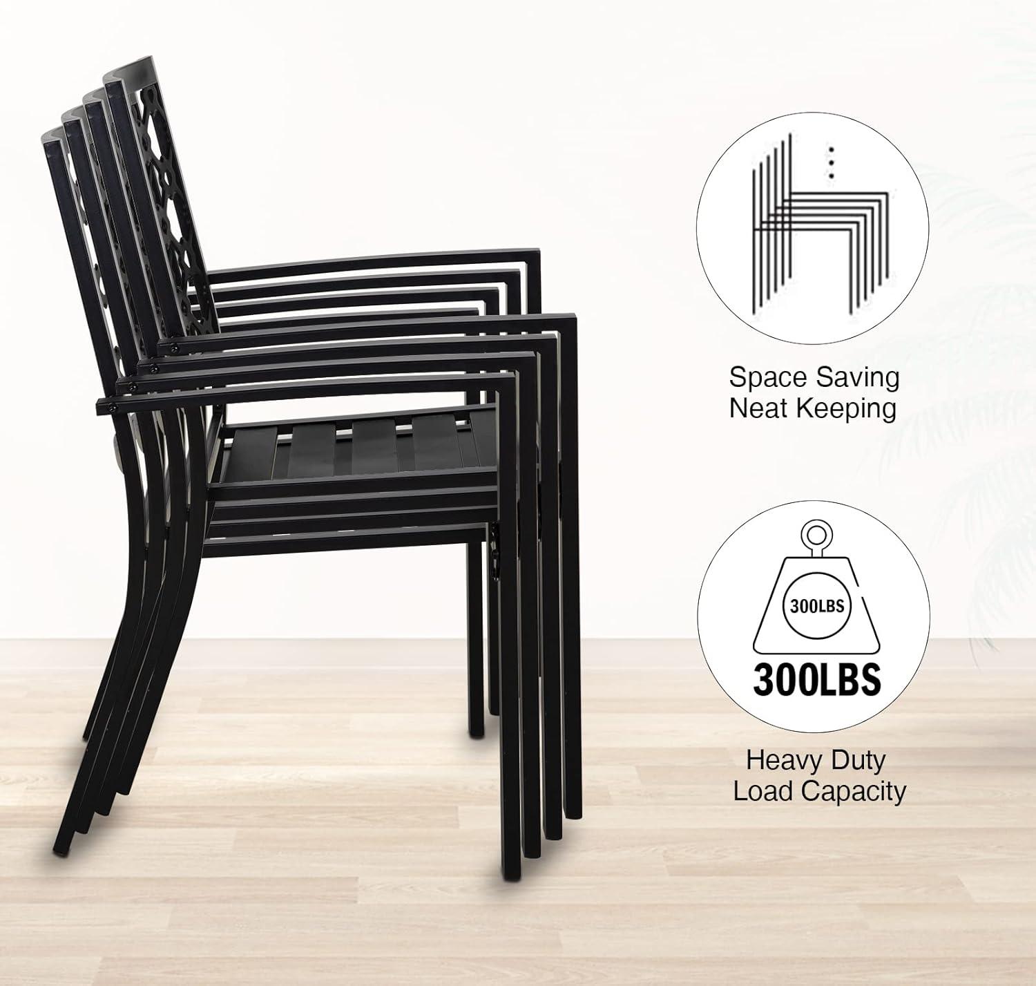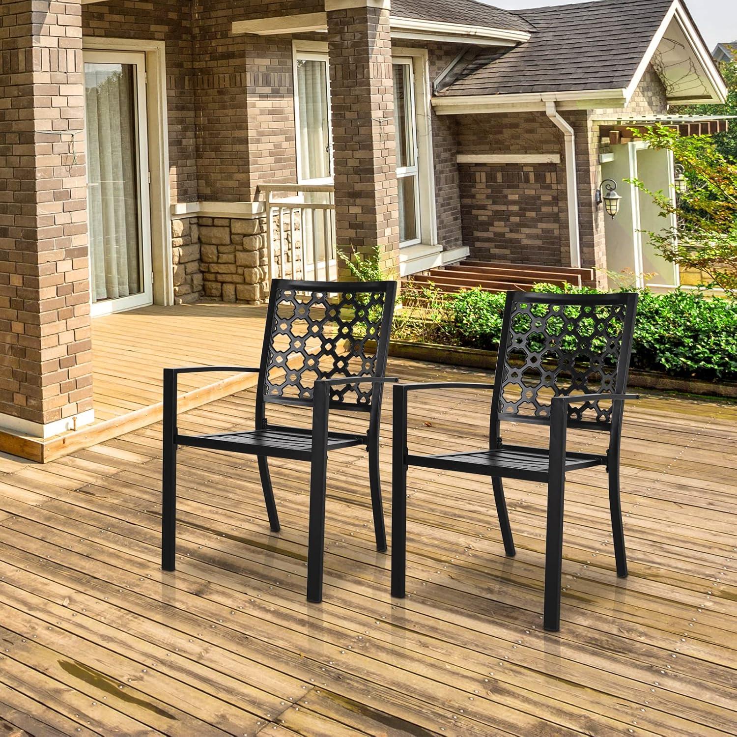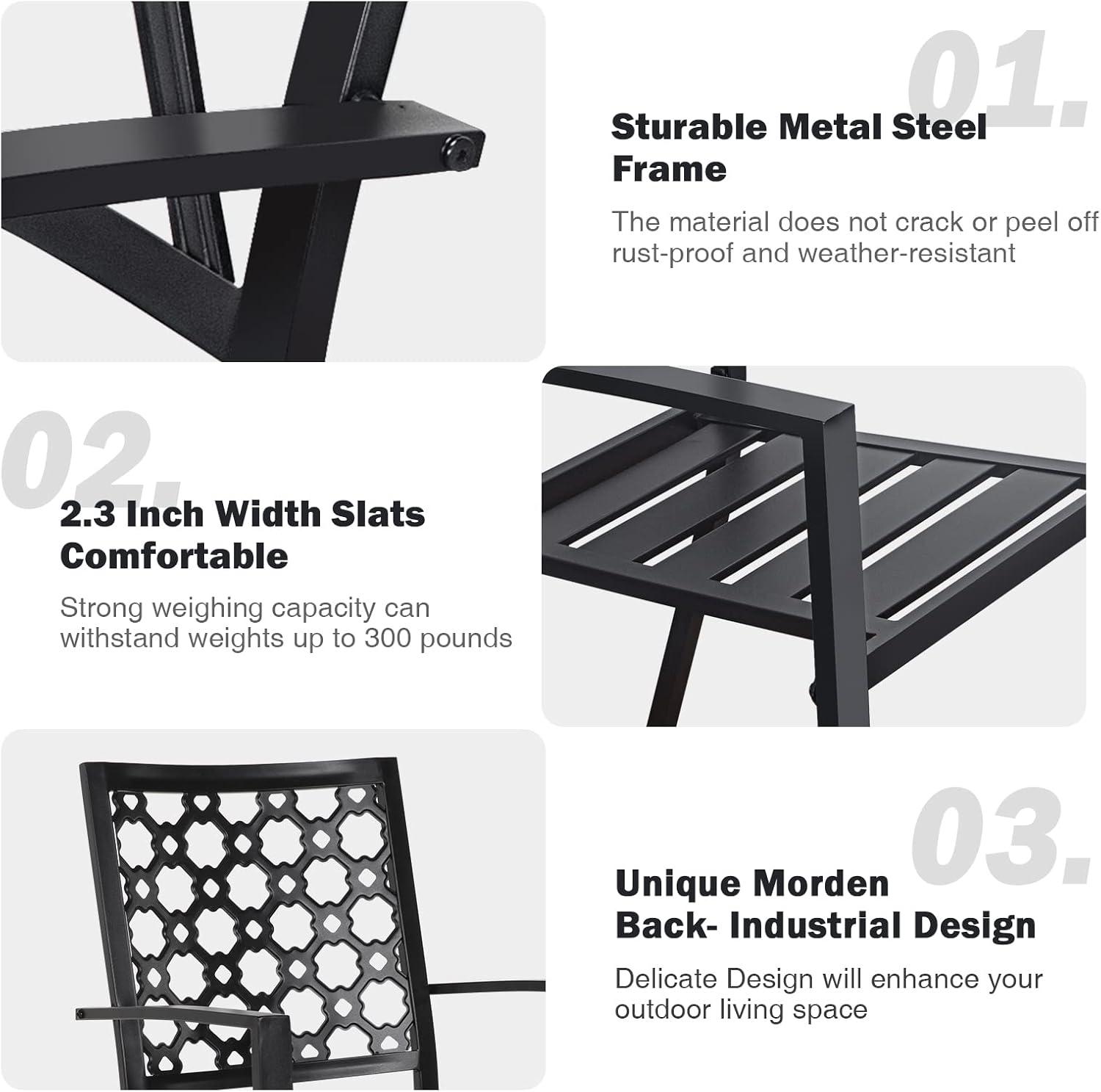 The two stackable chairs bring excellent versatility too. Their ergonomic backrest and armrest provide comfortable support, perfect for relaxing or dining outdoors. at a width of 22.5 inches and a height of 35 inches, they slide easily under the table to save space when not in use. The durable wrought iron frame is rust-proof and weather-resistant, meaning it holds up beautifully in various climates, whether you’re placing it on a covered patio or out in the open garden. Here’s a quick glance at how the set’s dimensions align with some popular outdoor settings: