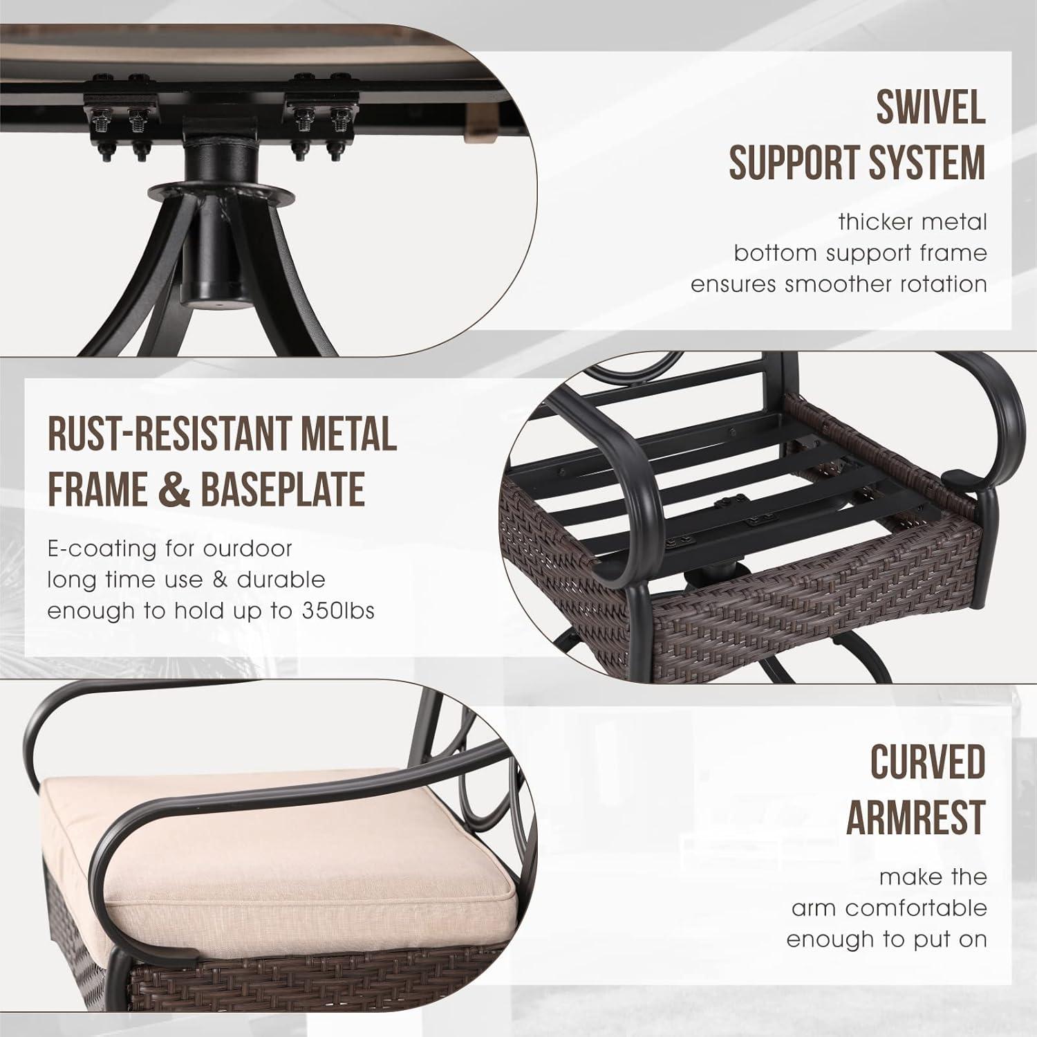 Comfort is another highlight, with each chair featuring 360-degree swivel capabilities and a gentle rocking motion that encourages relaxed conversations and easy accessibility from any angle. The padded cushions are filled with high-density sponge for added coziness and come in splashproof beige fabric equipped with zippers for hassle-free cleaning. Setting up this set was straightforward, with all necessary components included and a design that simplifies assembly without compromising sturdiness. Below, we’ve summarized the key design and build features:
