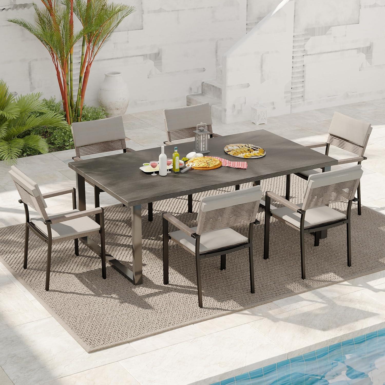• 【7-Piece Dining Chair Set】This patio dining set contains 1 extended dining table and 6 ergonomic dining chairs. This modern outdoor dining table set features aesthetic appeal that seamlessly blends with various outdoor settings, adding charm and elegance to your patio or garden, which is perfect for your family events.