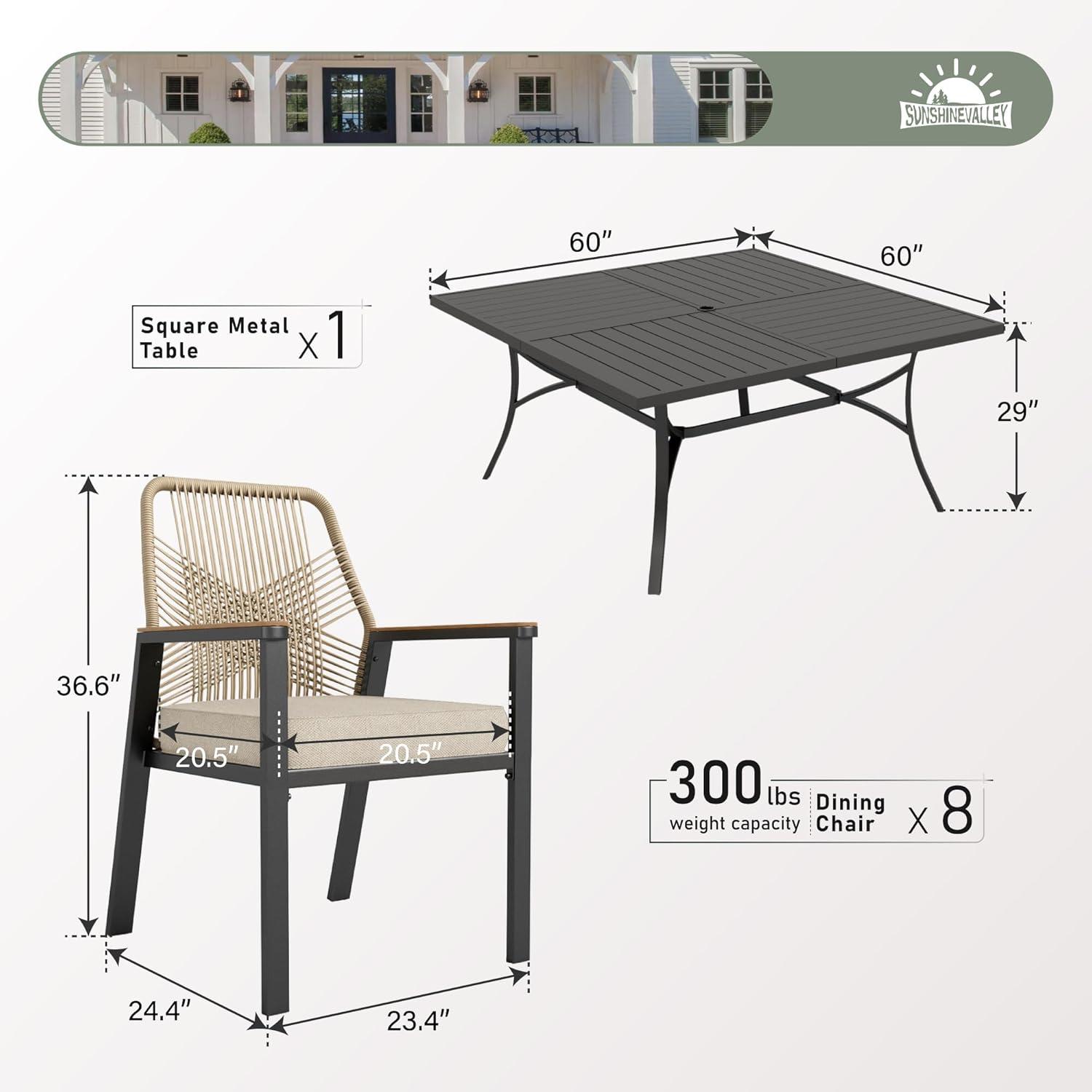 Over time, living with the 9 Pieces Patio Dining Set, 8 x Woven rattan Chairs with Waterproof Cushion, 60″ Square Metal Dining Table with Umbrella Hole, Outdoor Table and Chairs Set for Backyard Lawn and Deck, Beige, you notice how chairs are habitually pulled out and cushions soften where someone always sits. In daily routines the comfort becomes predictable, the table surface quietly gathers faint marks as the room is used, and those little signs of wear slot into regular household rhythms. It lives as a steady backdrop for mugs, a tossed bag, short conversations, and in that ordinary way you find it stays.