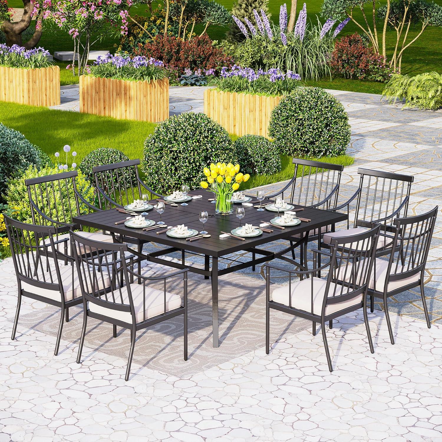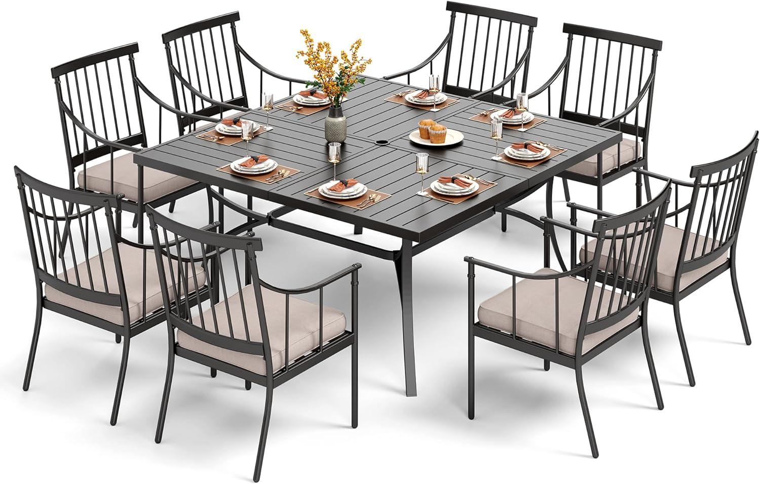 The set instantly impressed us with its robust construction and thoughtful design. The large 60″ square wrought iron table is both sturdy and stylish, featuring a slatted tabletop and a convenient 2-inch umbrella hole that adds practicality for sunny days. Crafted with a special ecoating finish, it promises resistance to rust, scratches, and fading-qualities that are essential for outdoor furniture. We were pleased to find that each chair, made from heavy-duty steel, is accompanied by a thick 3.5-inch polyester-filled cushion,providing genuine comfort without compromising on stability or weight capacity. this set balances durability with elegance, turning any outdoor space into a welcoming dining area suitable for eight people.