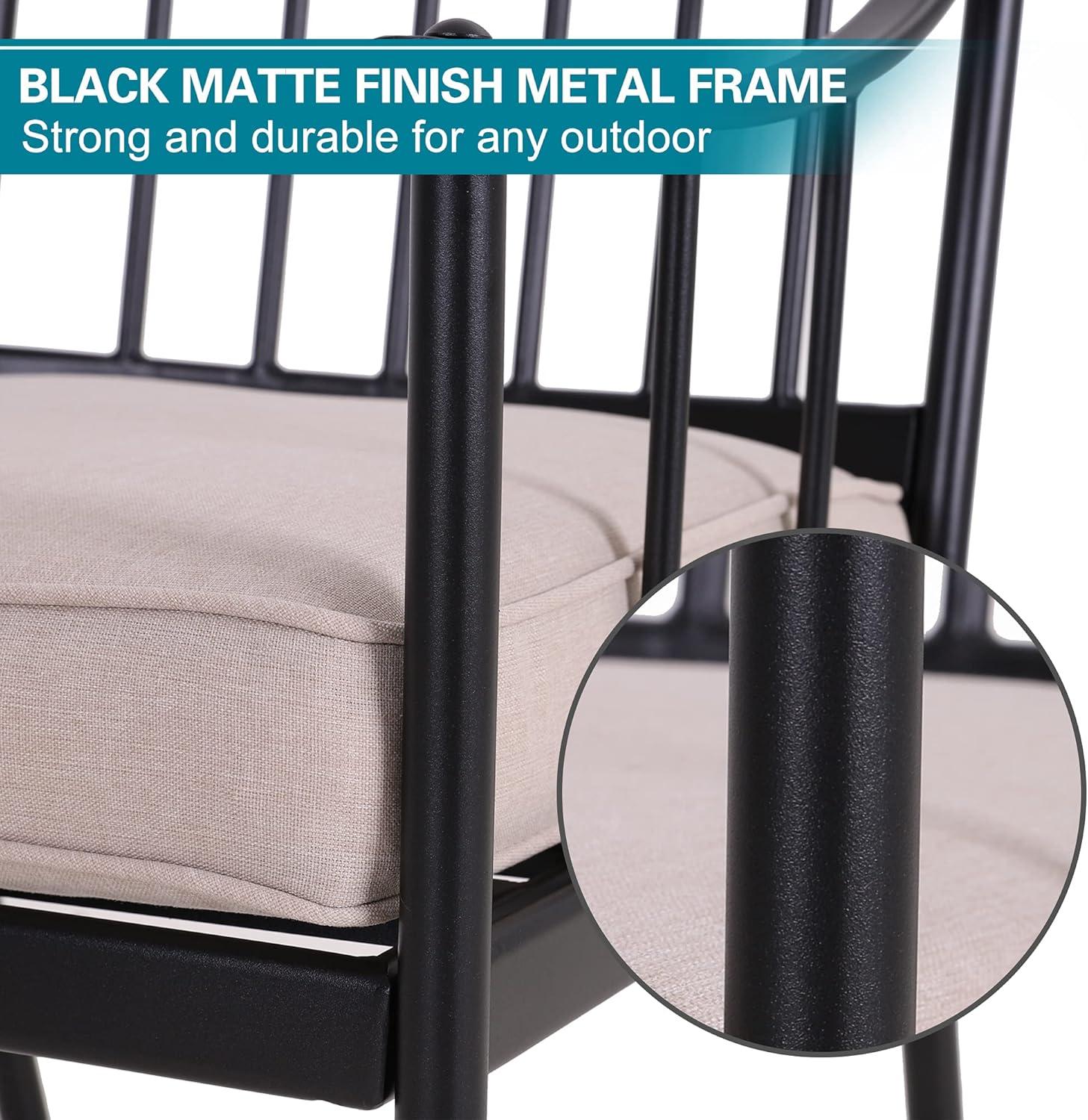 Our experience with the chairs in this dining set highlights a perfect balance between robust construction and inviting comfort. The chairs are crafted from heavy-duty steel coated with a black ecoating finish, which not only provides a sleek look but ensures excellent resistance to rust, scratches, and UV damage.This protective layer is essential for outdoor furniture, allowing the set to withstand the elements season after season without compromising its structural integrity. With dimensions of 21.3″L x 22.0″W x 35.4″H and a weight capacity of up to 300 lbs, these chairs offer both stability and generous seating space, making them suitable for a wide range of users.
