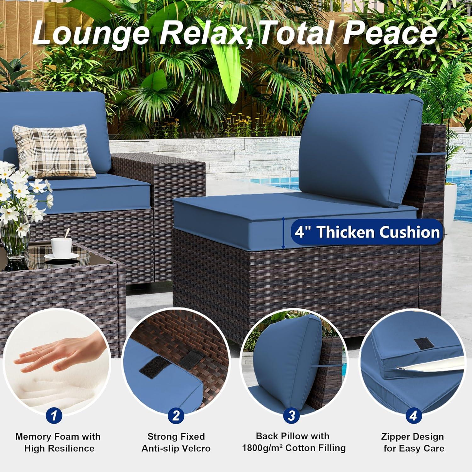 The cushions are truly the heart of comfort in this outdoor set. Crafted with high-density rebound foam, they offer a plush, supportive feel that quickly invites you to sink in and unwind after a long day. thier generous thickness pairs beautifully with the soft back pillows, making every seating position cozy – whether your sitting upright or reclining slightly. We appreciated how roomy the seats are, giving us the freedom to lounge without feeling cramped. Plus, the covers are removable and washable, featuring quality zippers that make upkeep a breeze. This means we can enjoy fresh, vibrant cushions season after season without any hassle.