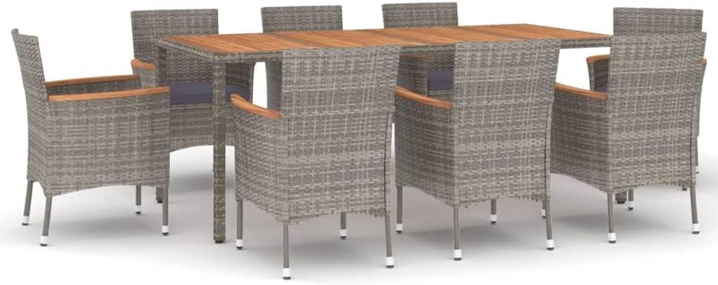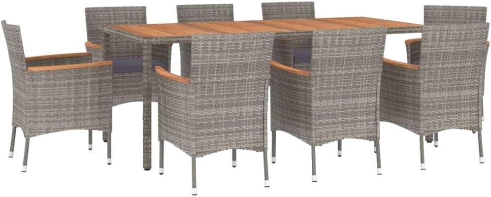 From the moment we set up this 9-piece patio dining ensemble, the blend of modern and natural elements immediately enhanced our outdoor space. the gray weather-resistant PE rattan weaves a sleek yet inviting texture, perfectly complementing the solid acacia wood tabletop that brings a warm, organic touch to the design. The powder-coated steel frames underpin a sturdy structure without sacrificing elegance, keeping the overall look both robust and refined. Its spacious 74.8-inch table offers generous room for sharing meals, playing games, or simply relaxing, making it an ideal centerpiece that invites everyone to gather around.