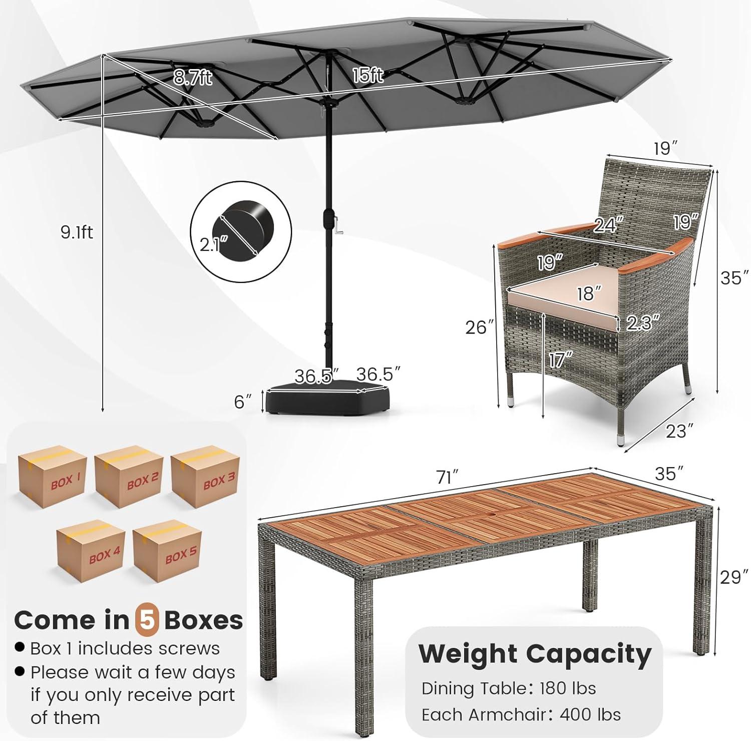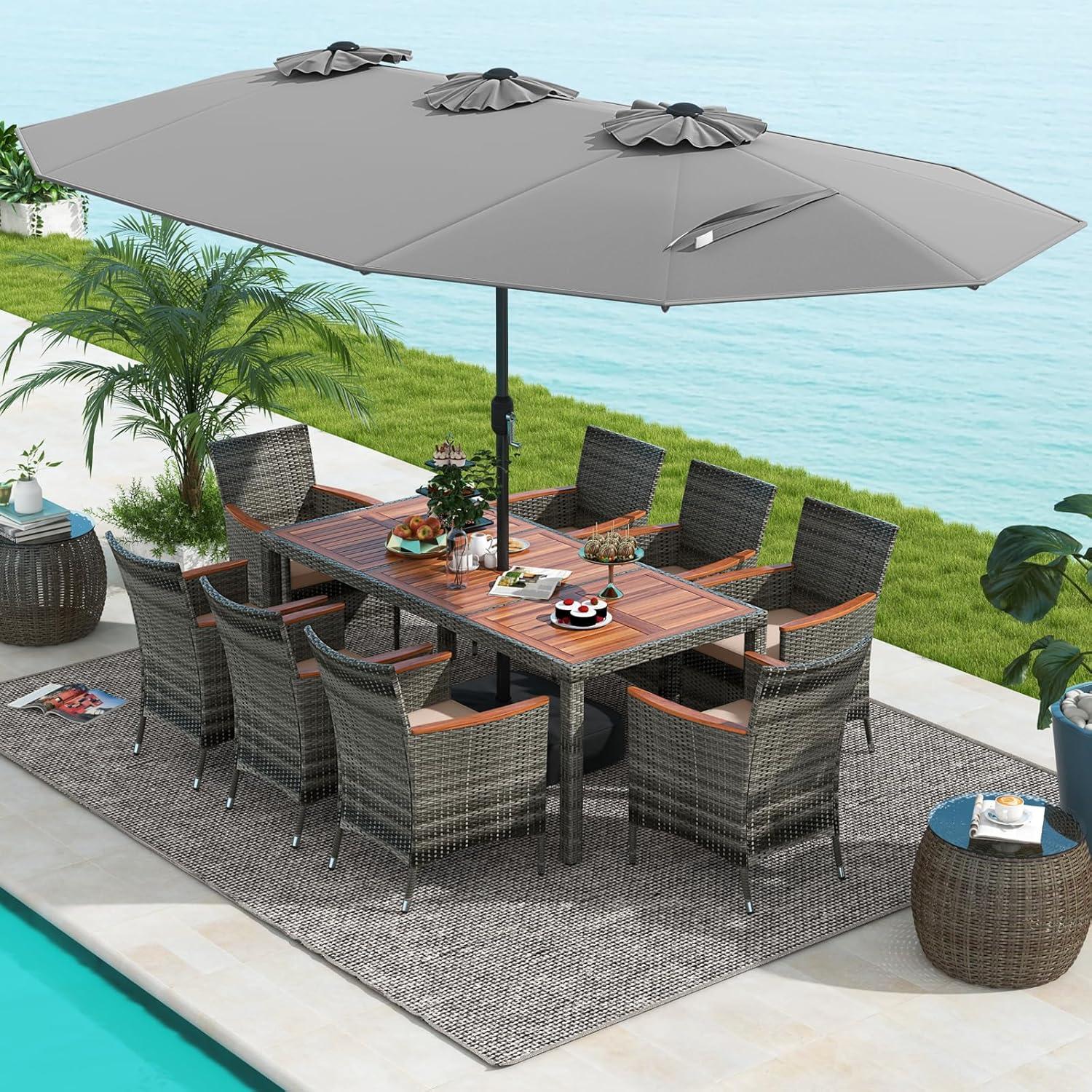 Beyond protection, this umbrella seamlessly integrates style with functionality, complementing the elegant acacia wood and PE rattan dining set. Its double-sided design maximizes shade on both sides, perfect for larger gatherings as it covers a vast area over the table and armchairs. This means every guest can relax comfortably in shaded comfort without crowding or repositioning frequently. Here are a few key features that truly elevate the outdoor ambiance: