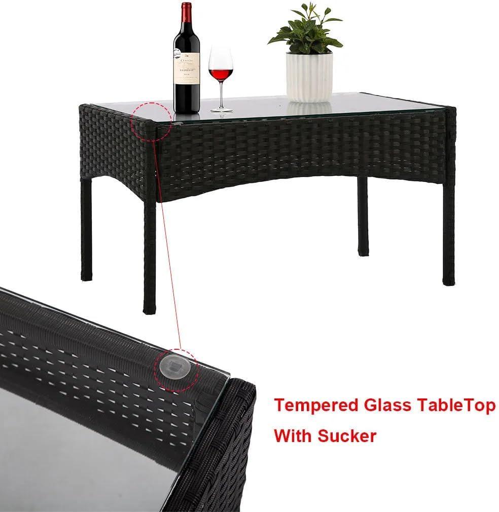 What immediately stood out to us was the perfect blend of modern simplicity and elegant craftsmanship. The set features a sleek glass top side table, which is not only visually appealing but also highly practical for holding drinks or decorative accents. The understated black wicker seats, combined with the clean lines of the powder-coated steel frame, offer a stylish yet functional aesthetic that fits seamlessly in a variety of outdoor settings, from small balconies to spacious backyards. The thoughtfully designed cushions add an inviting layer of comfort without overwhelming the minimalist design.