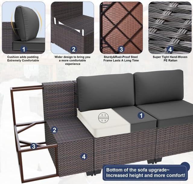 Beyond the plush feel,the sturdy rust-proof steel frame beneath adds a sense of durability without compromising comfort. the rattan weave is flexible enough to add a subtle give, enhancing overall coziness. Sitting here daily has proven that this set can handle everything from casual coffee mornings to lively backyard gatherings while maintaining its cushioning integrity. For those who appreciate customization, the sectional pieces let us arrange the set however we want, making comfort personal as well as practical.