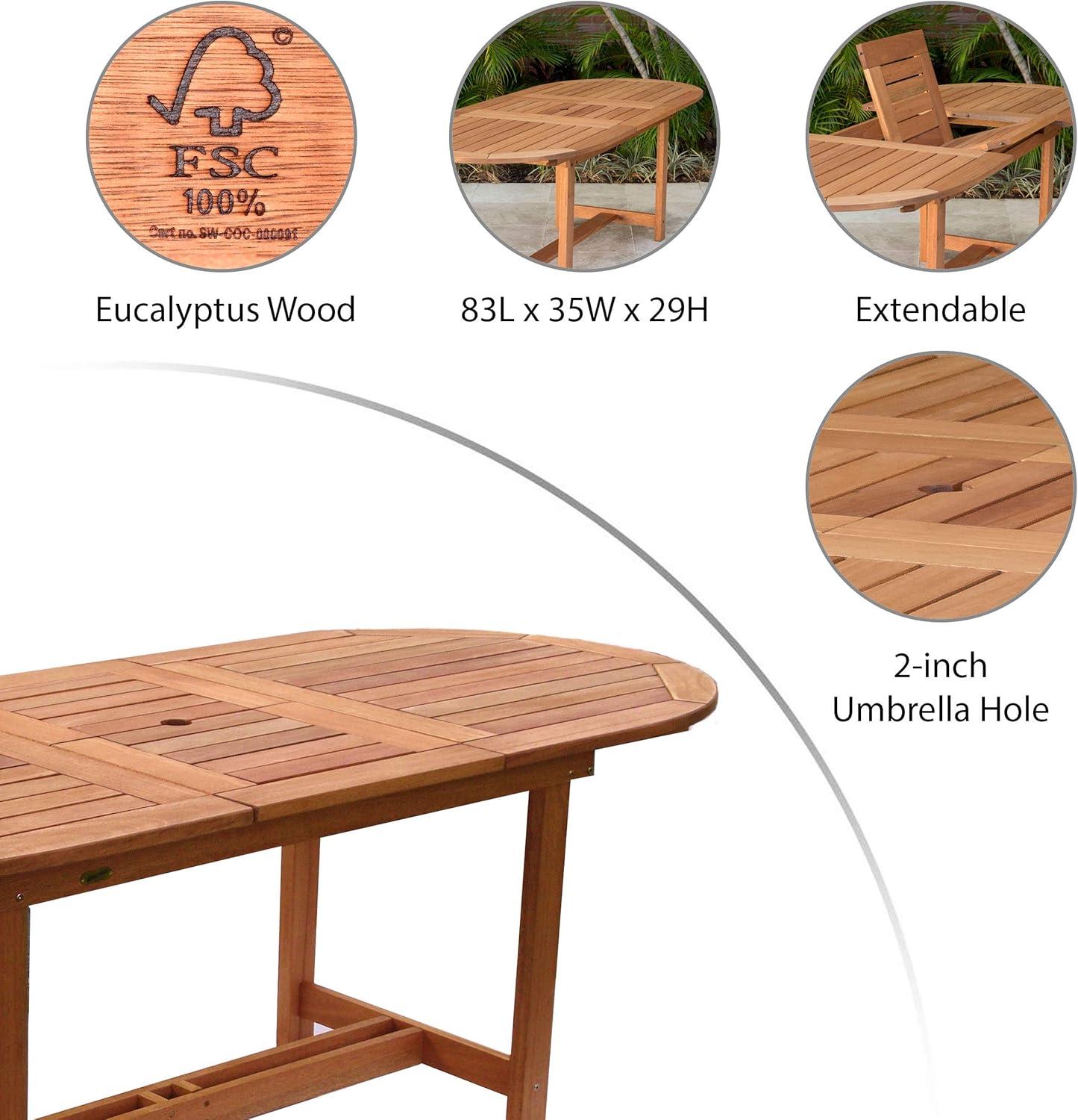 We found this dining set impressively versatile, seamlessly bridging the gap between outdoor durability and indoor elegance. Its rich eucalyptus wood finish paired with sleek wicker chairs enhances the natural ambiance on our patio without compromising on style inside our dining room. The extendable oval table allows us to adjust the length from 63″ to 83″, giving us flexibility whether we’re hosting a casual family lunch or a larger dinner party. Plus, the integrated 2-inch umbrella hole is a thoughtful feature that enhances the outdoor experience but remains discreet enough to suit indoor use perfectly.