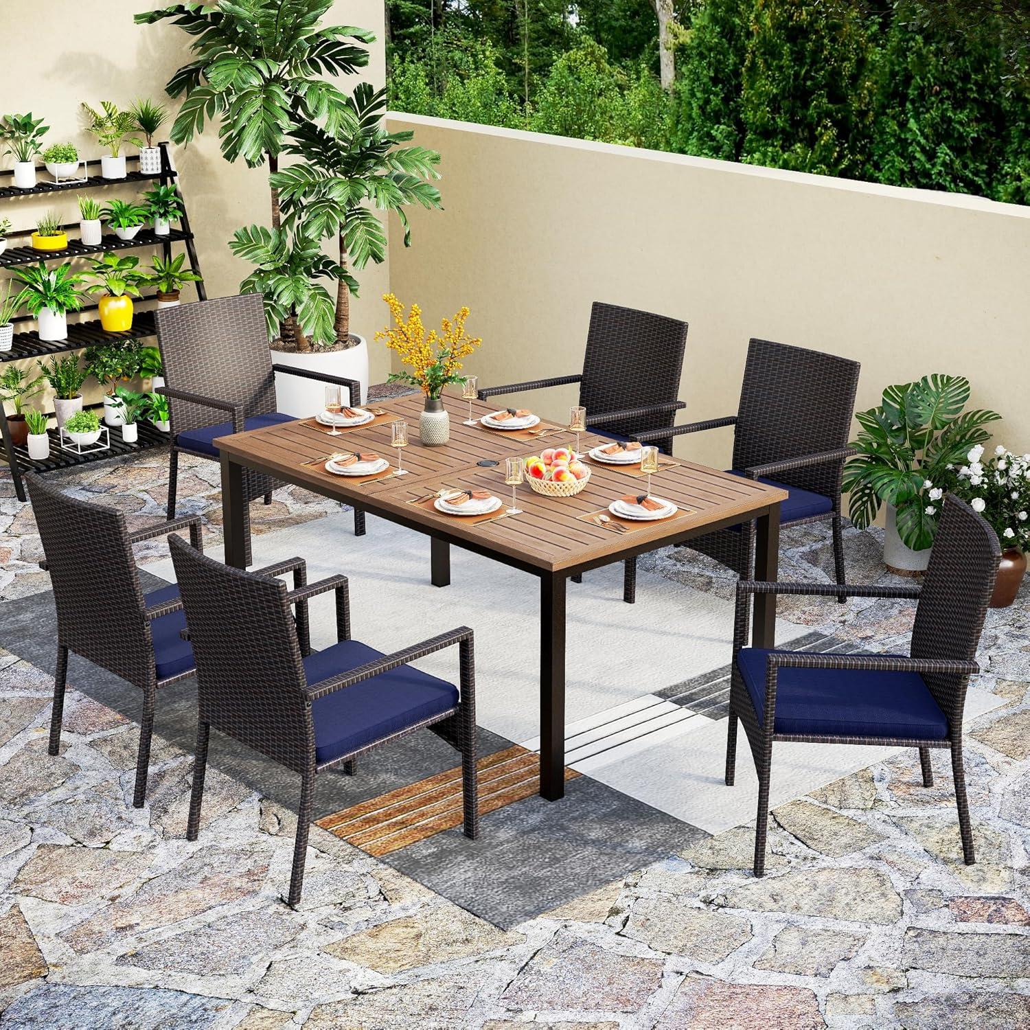 • 【7-Piece Dining Chair Set】This patio dining set contains 1 extended dining table and 6 ergonomic dining chairs. This modern outdoor dining table set features aesthetic appeal that seamlessly blends with various outdoor settings, adding charm and elegance to your patio or garden, which is perfect for your family events.