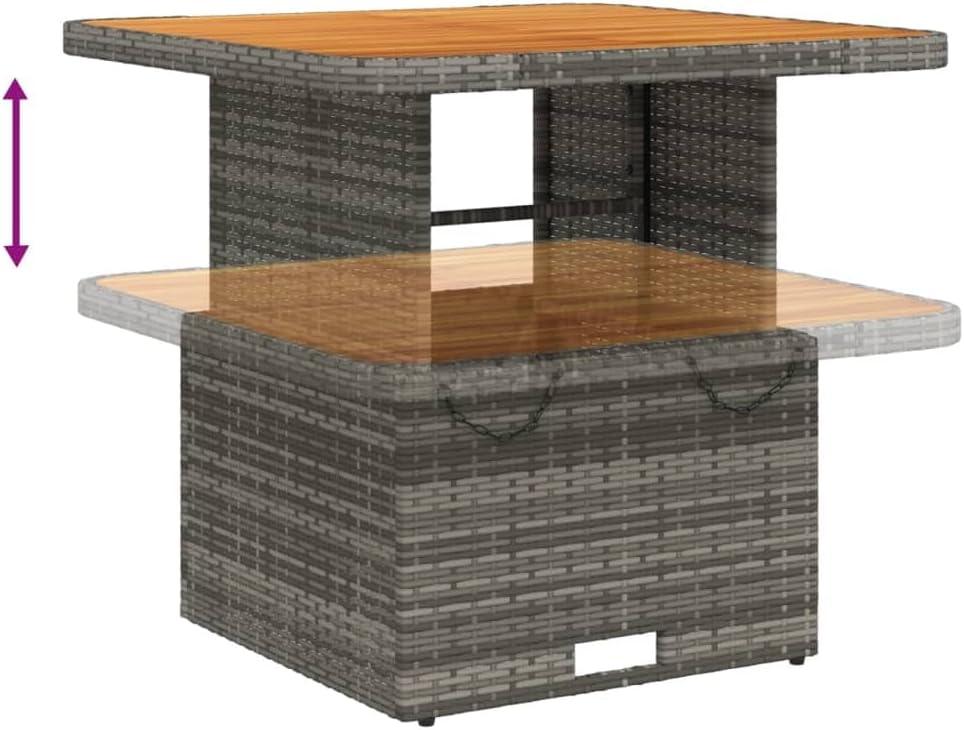 when you first set the pieces out, the woven surface catches the light in places and the gray tone reads as a quiet, neutral backdrop. The cushions sit a little proud of the frames; you find yourself smoothing their covers and tugging at a zipper or two to settle seams. Each chair has a small handle at the side that you instinctively pull — the backrest moves in a few distinct positions and clicks into place, and when you return it upright it snaps back with a quick motion. The table top sits low at first, a flat plane that looks right for drinks; lifting it requires a deliberate push and the top rises to a higher level, revealing the warmer wood grain beneath. At the feet, small plastic pads meet the ground and you can feel them take up tiny unevennesses as you nudge a chair into position.
