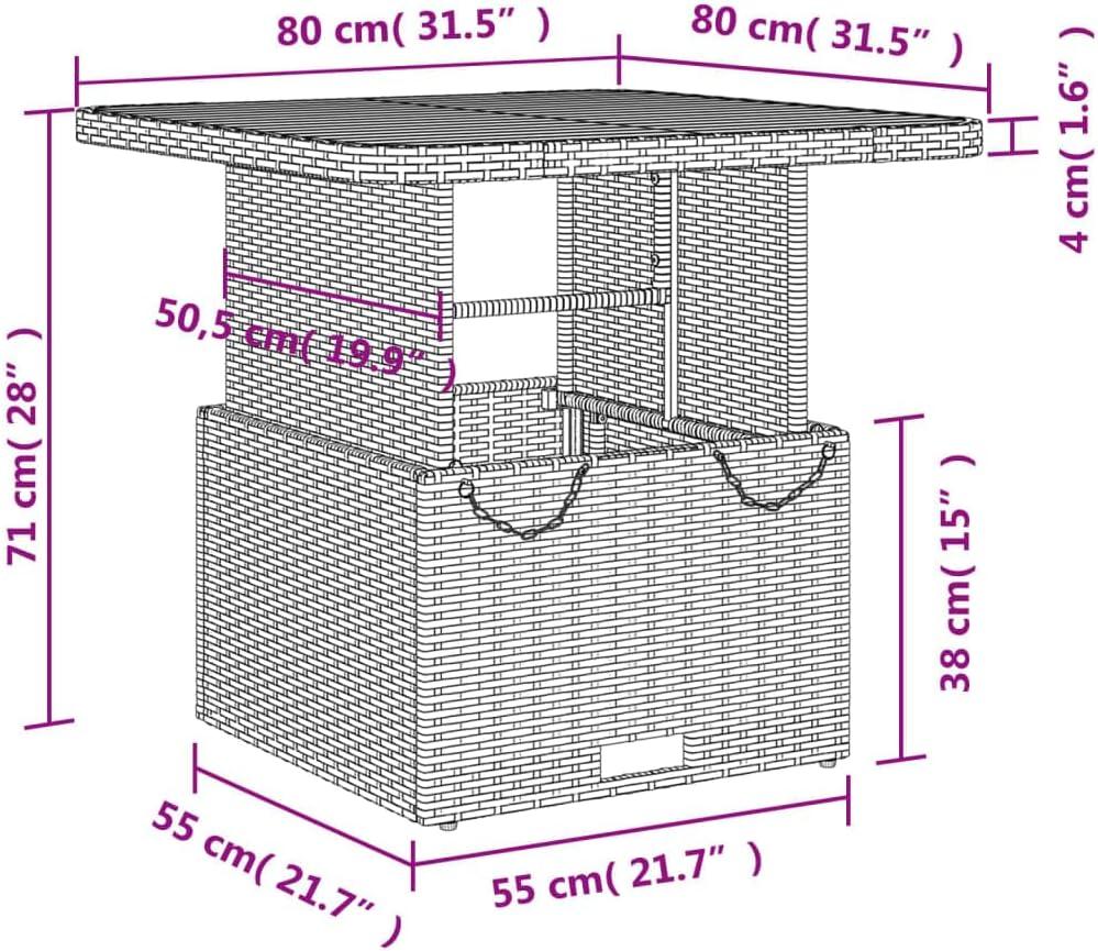 In tighter spaces the arrangement tends to feel compact: with the tabletop lowered and the chairs slid in, the group reads as a low, square cluster rather than a sprawling dining set. On a typical small patio or wide balcony the chairs can be tucked close to the table so the footprint stays relatively contained; cushions are often smoothed or nudged inward after sitting, which slightly reduces the visible bulk. When the tabletop is lifted to dining height and chairs are pulled out, the area used expands noticeably, and movement paths around the set become narrower.
