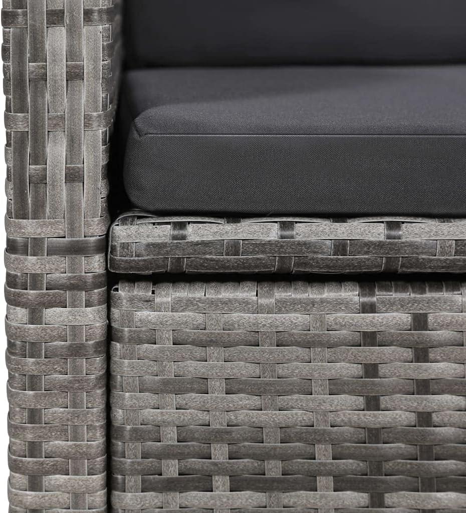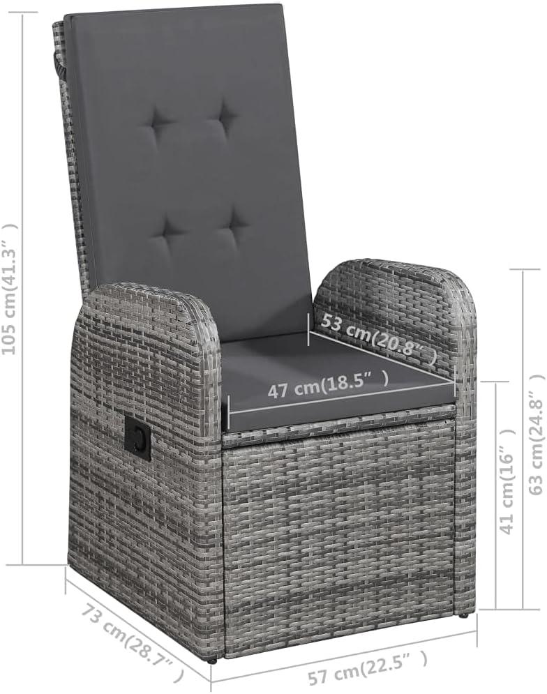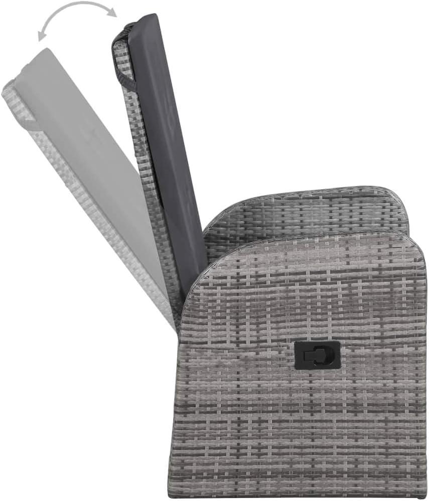 When you approach the set for the first time, the muted gray of the woven seats meets a warmer, oiled wood table top—an easy contrast that draws your hand to the grain. The rattan weave shows small variations where strands tuck under one another, and the powder-coated frame lines look tidy but not clinical. Cushions sit plump on the chairs at first glance; you’ll likely smooth them once or twice, noticing the zipper along the back seam and the slightly textured polyester as you do. From a few steps away the arrangement reads compact and orderly, and up close the reclining mechanism’s button is small but reachable without shifting your weight entirely.