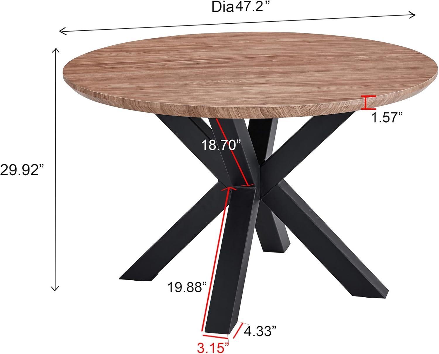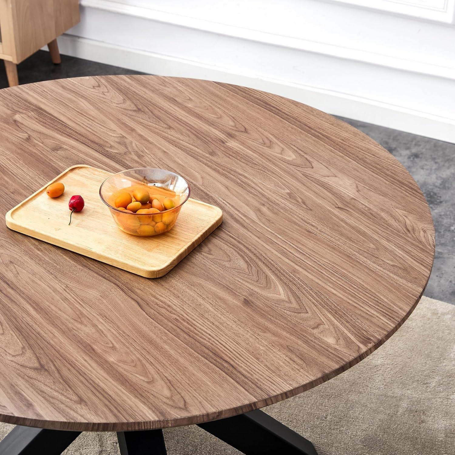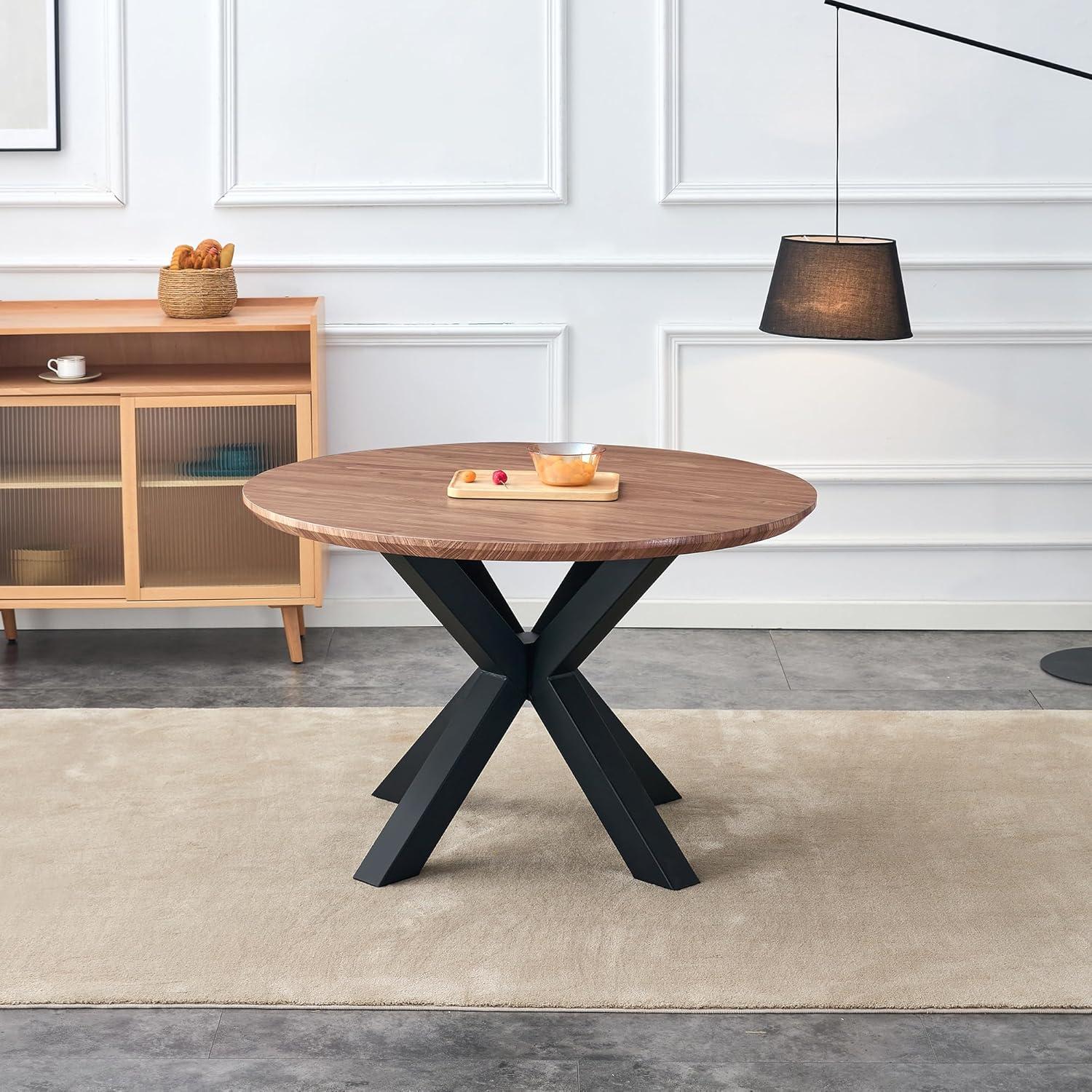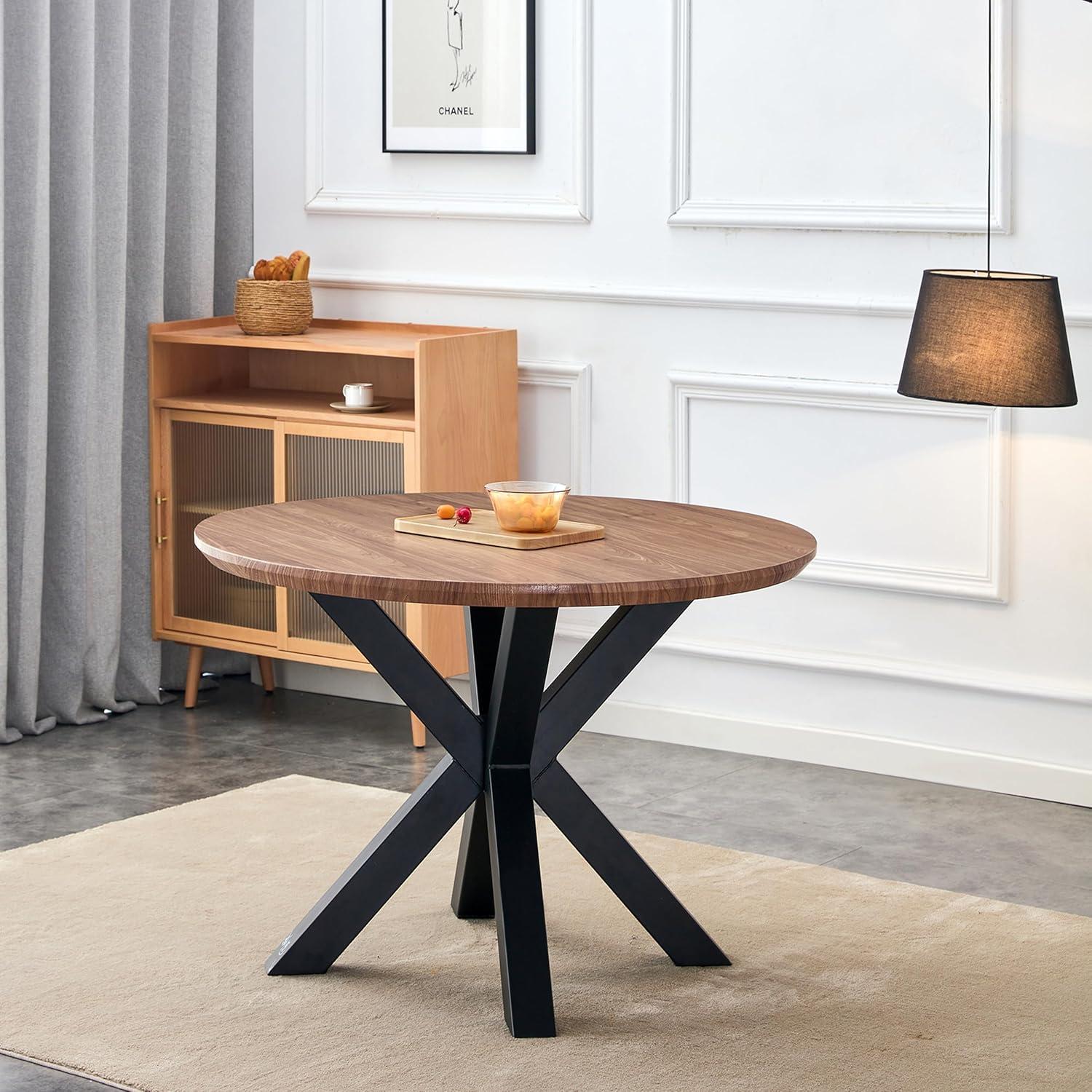The round ‌top tends to read as a central point rather than a⁢ block along a wall; chairs can sweep around it without sharp corners ⁣interrupting circulation. From different approach angles the walnut-pattern surface catches light‌ and shows smudges or ​crumbs more readily than matte finishes, so daily contact —⁢ sliding plates into place, nudging chairs back — leaves small ​traces that get smoothed away during routine wiping. The ‍metal cross ​base makes ⁣the table feel visually lighter than a four‑leg design, but the ‌central support also becomes the place where feet and chair legs meet more frequently enough, producing a quiet, recurring ⁣rhythm ​of little adjustments and retucks under the table.