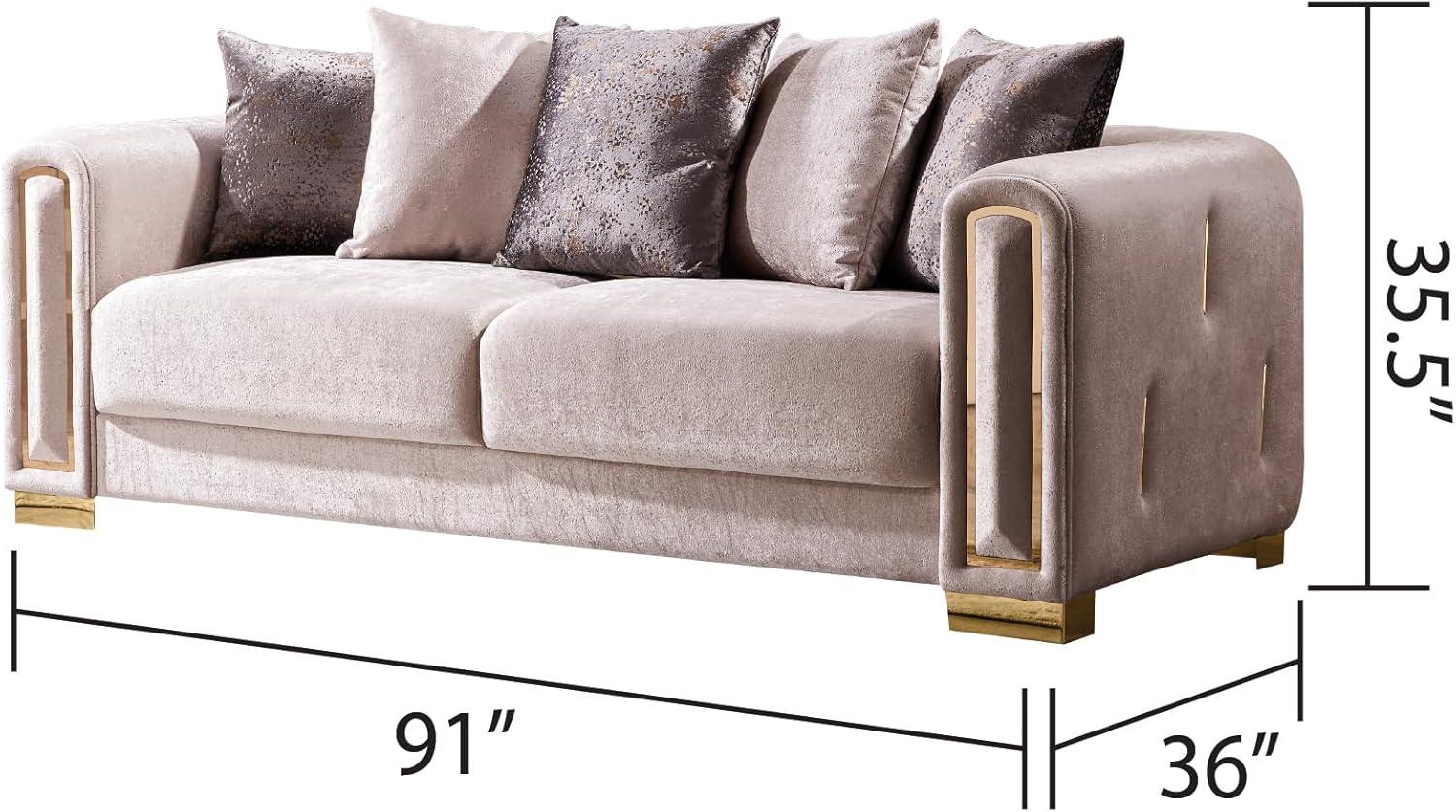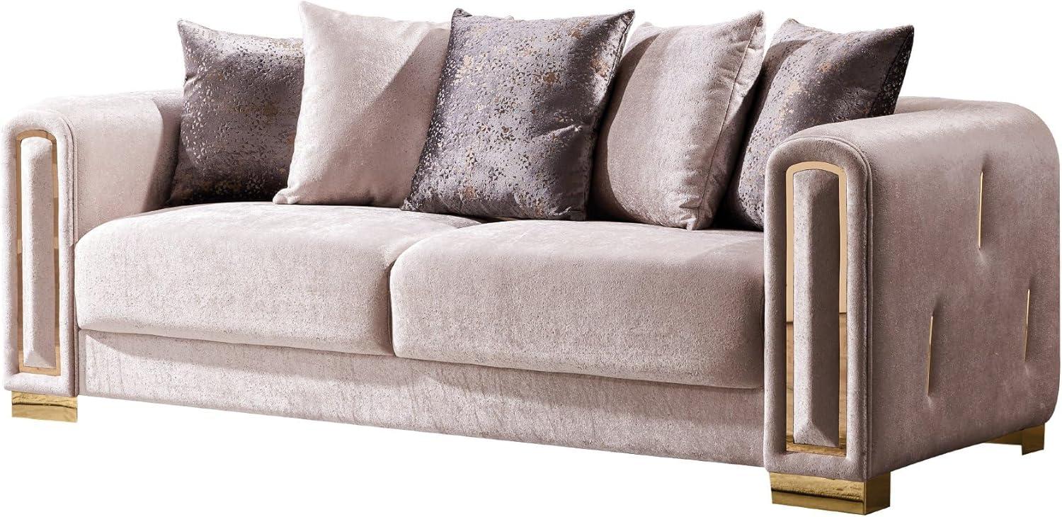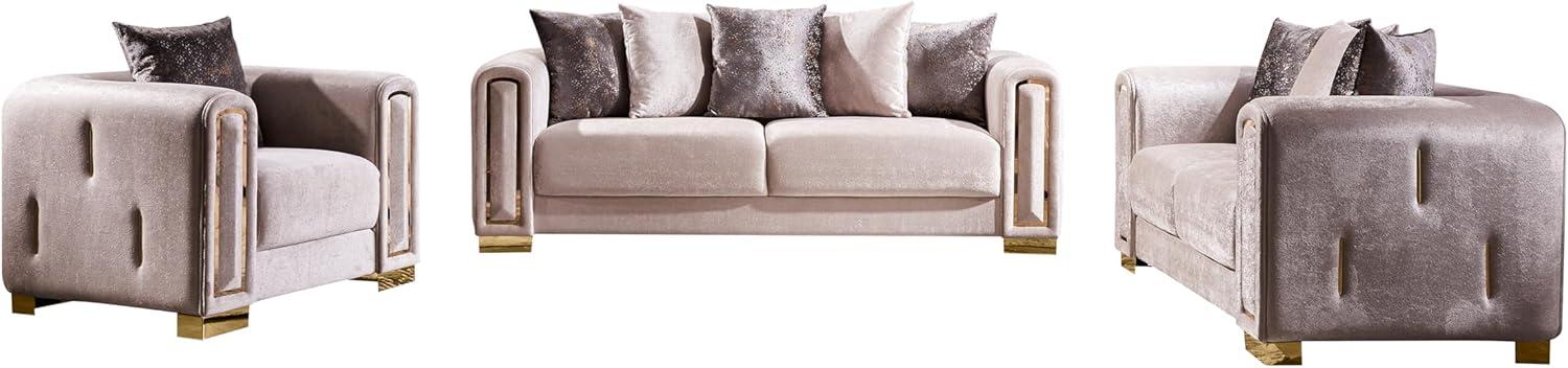 Crafted with sturdy birch wood frames, this set promises lasting durability that withstands daily use. The plush velvet upholstery elevates comfort, enveloping us in a luxurious softness with every seat. Complemented by elegant gold-finished legs and refined gold line detailing along the arms and back,the overall design effortlessly instills a modern,upscale vibe in any living space. Its neutral beige tone adapts seamlessly to various decor styles,making it a versatile choice for those seeking both style and comfort.