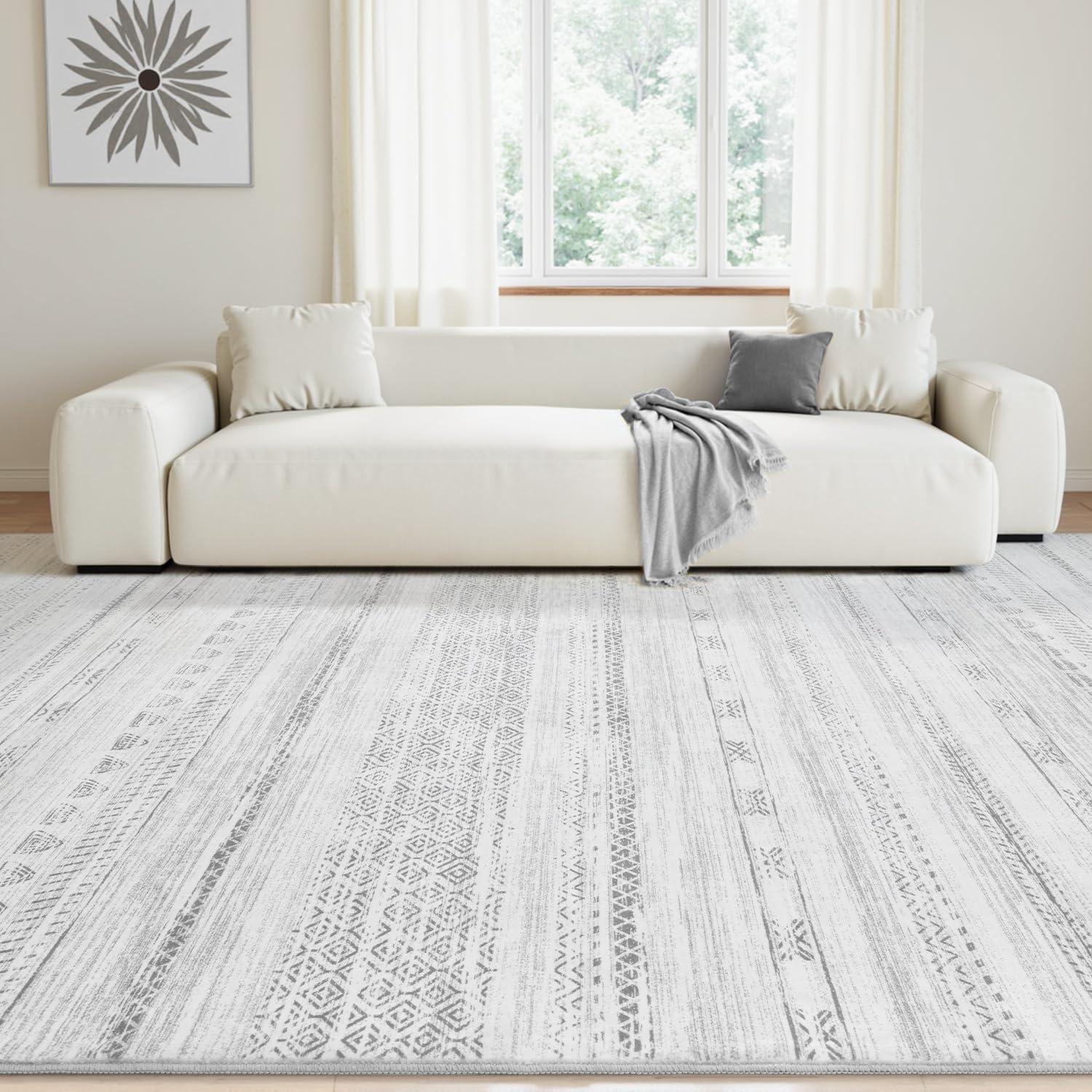Our experience with this area rug has been notably positive, especially considering how well it combines style and practicality. The soft, plush surface feels luxurious underfoot, adding warmth and comfort throughout the day.Its neutral gray tones paired with boho and Moroccan-inspired geometric patterns bring a subtle yet stylish aesthetic that blends effortlessly in our living room and bedroom. We also appreciate the carefully distressed finish, which lends a charming vintage vibe without looking worn out. Beyond looks, the non-slip TPR backing truly keeps the rug securely in place on our hardwood floors, giving us peace of mind, especially in high-traffic areas.
