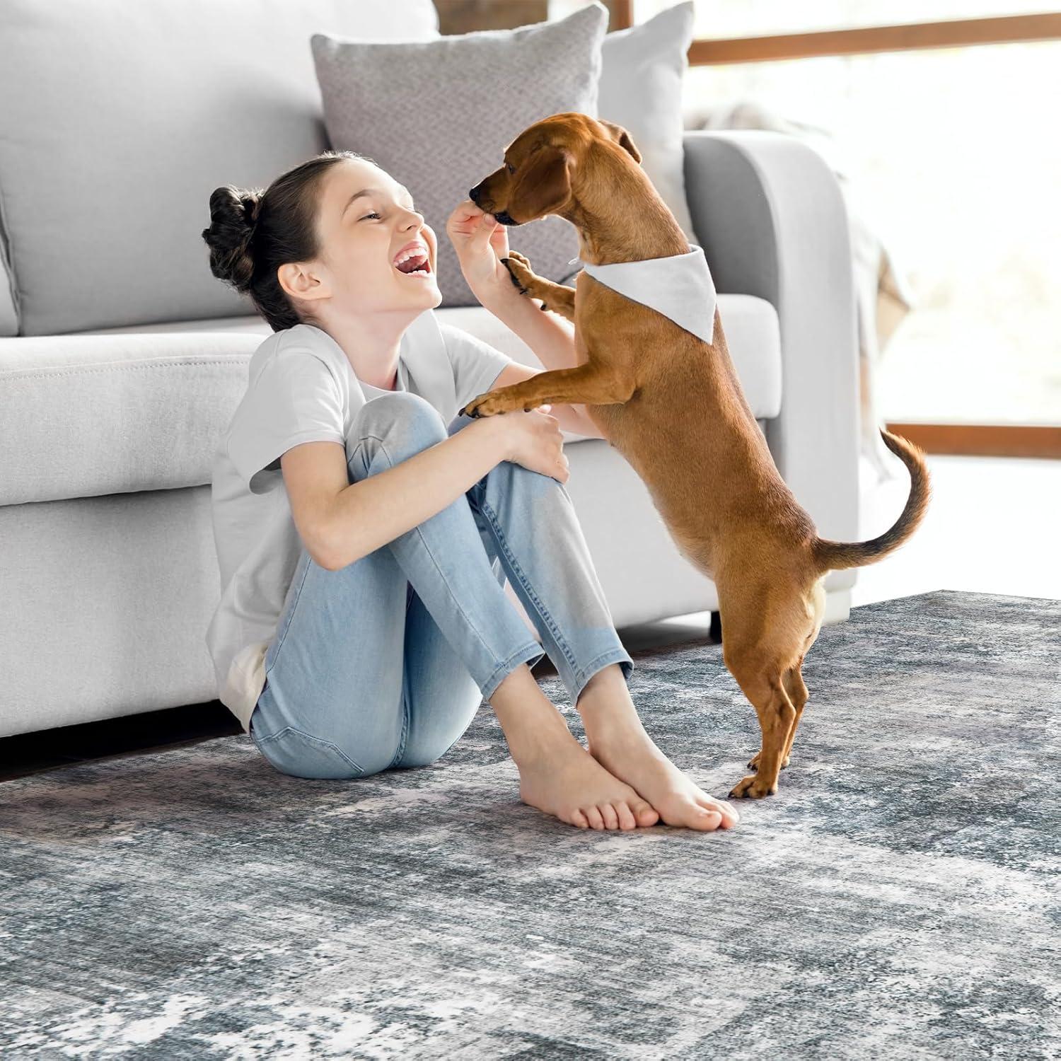 PureCozy 8x10 Washable Rugs for Living Room Blue Vintage Distressed Large Area Rug Non Slip Low Pile Floral Carpet Indoor Office Retro Rug for Bedroom Dining Room