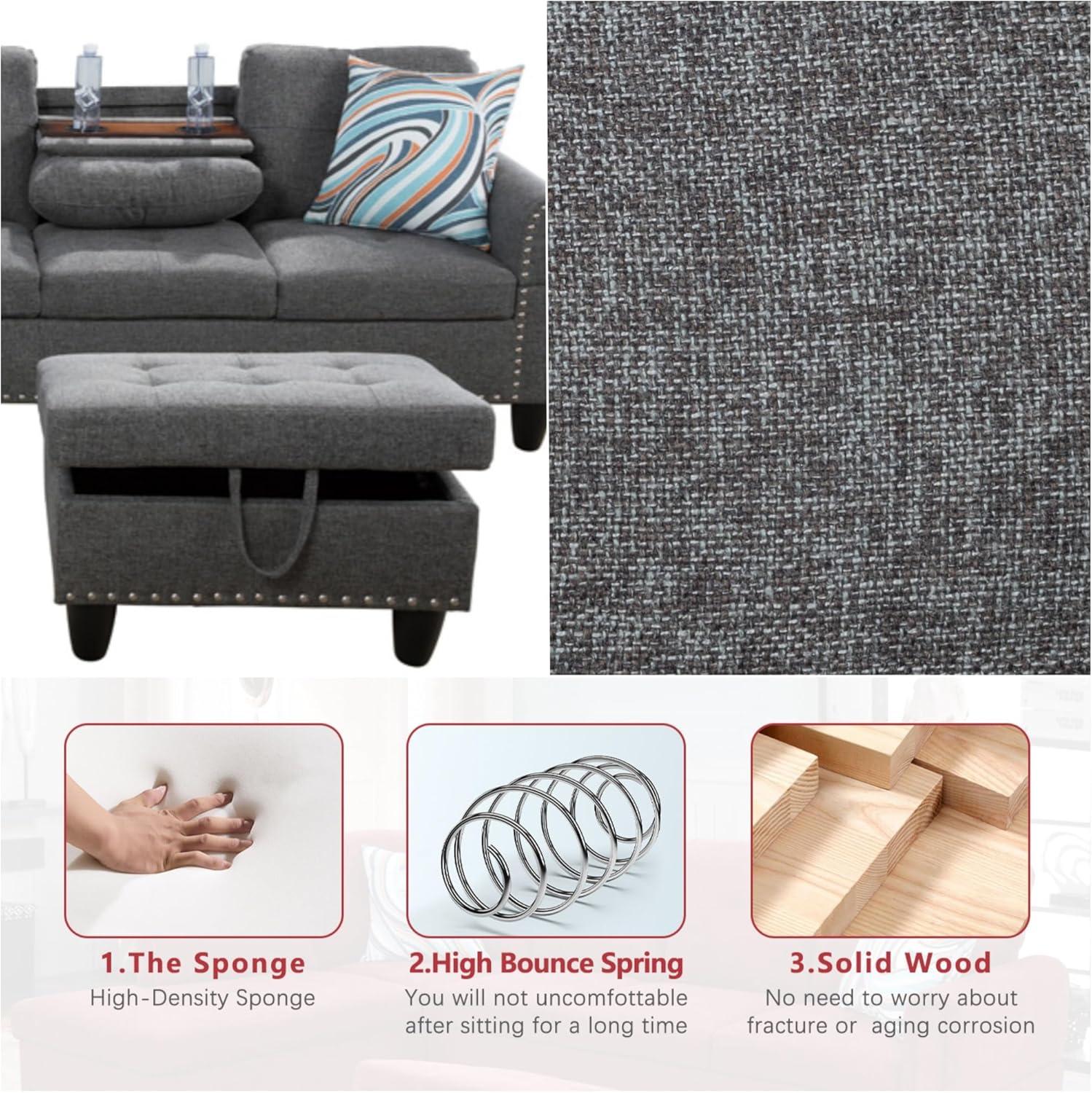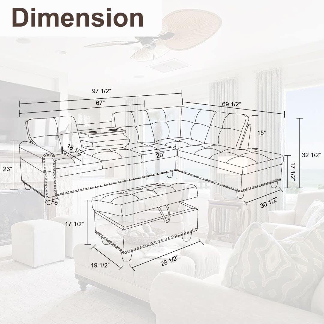We were immediately impressed by how this modular L shaped sofa effortlessly combines style with practicality. Its modern design, accentuated by subtle nail-head detailing, provides an elegant touch that complements various living room aesthetics.The built-in ottoman with a hidden storage compartment is a game changer, helping us keep the space clutter-free by neatly tucking away blankets, magazines, and other essentials.What truly stands out is the flip-up middle backrest that doubles as a console equipped with reversible cup holders and a small coffee table. This thoughtful feature perfectly suits our lifestyle, enabling us to relax with drinks and snacks close at hand without sacrificing comfort or space.
