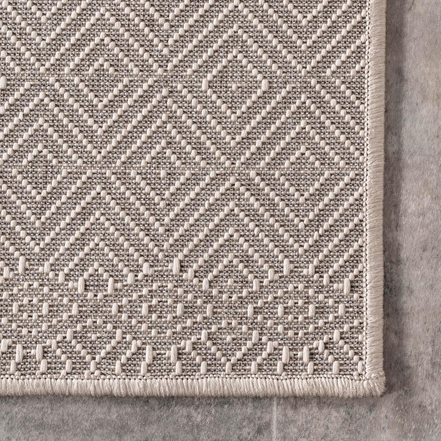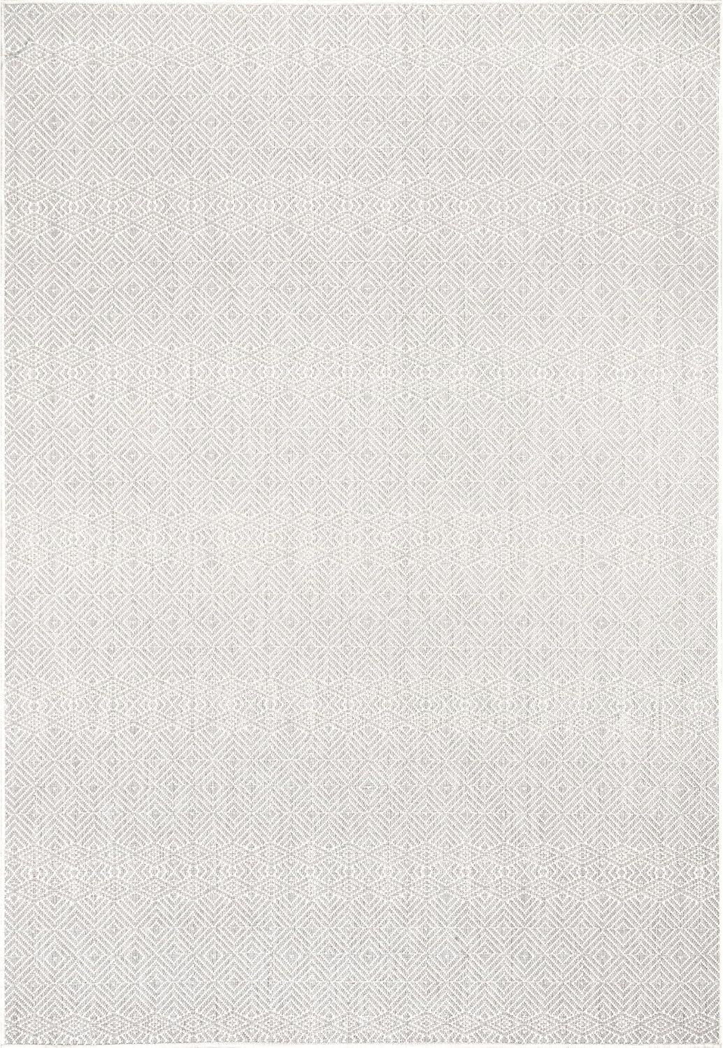 this outdoor area rug instantly elevates any space with its timeless geometric design in a soothing Paloma Grey hue. Crafted from a resilient blend of 90% polypropylene and 10% polyester with power-loomed construction, it promises both durability and style. whether placed on a patio, balcony, or even indoors in high traffic areas, it holds up beautifully against the elements and everyday wear. Its medium pile height strikes the right balance between comfort and easy maintenance, making it a practical yet sophisticated addition to your décor. the pattern’s subtle complexity allows it to seamlessly complement a range of interior styles, from modern minimalist to laid-back bohemian.