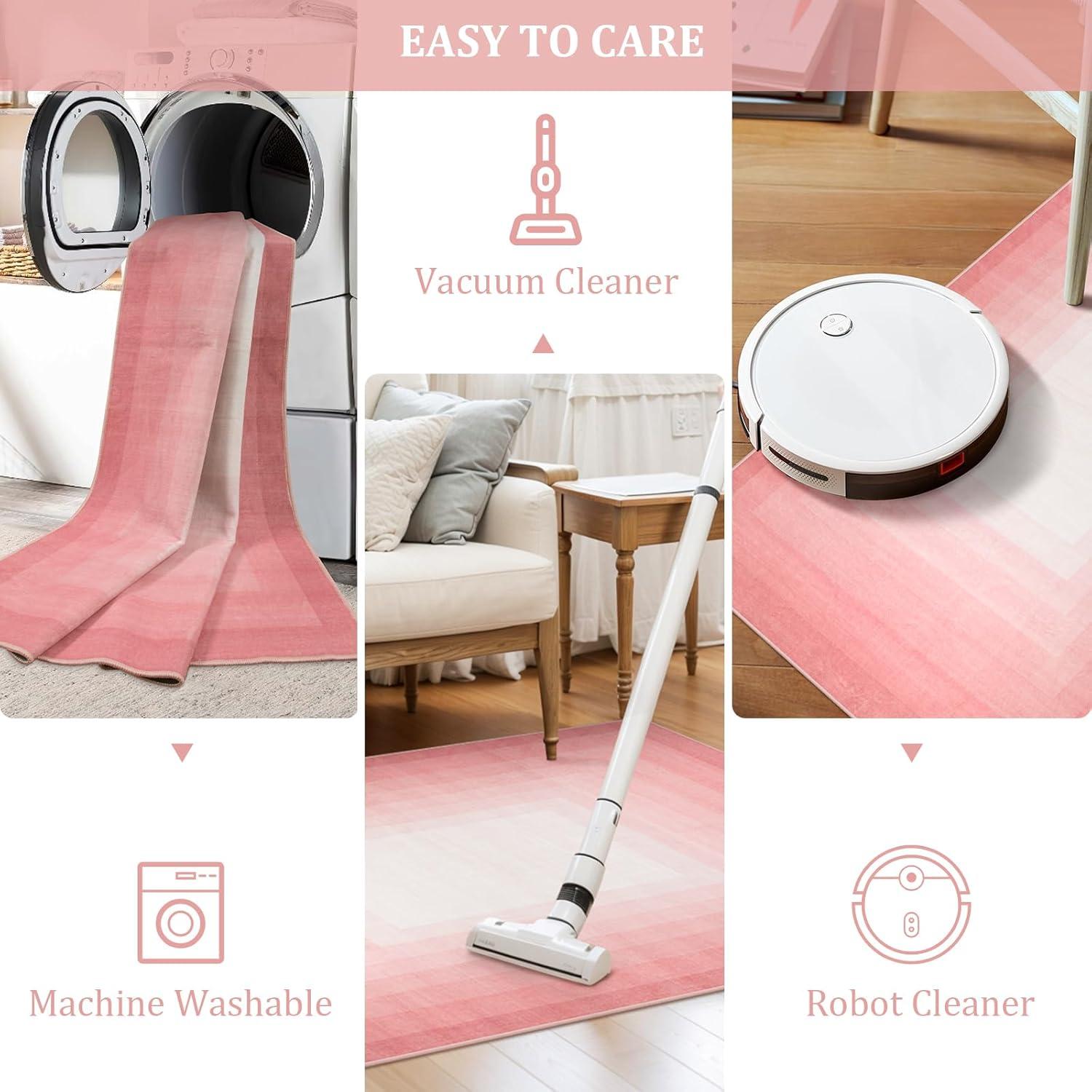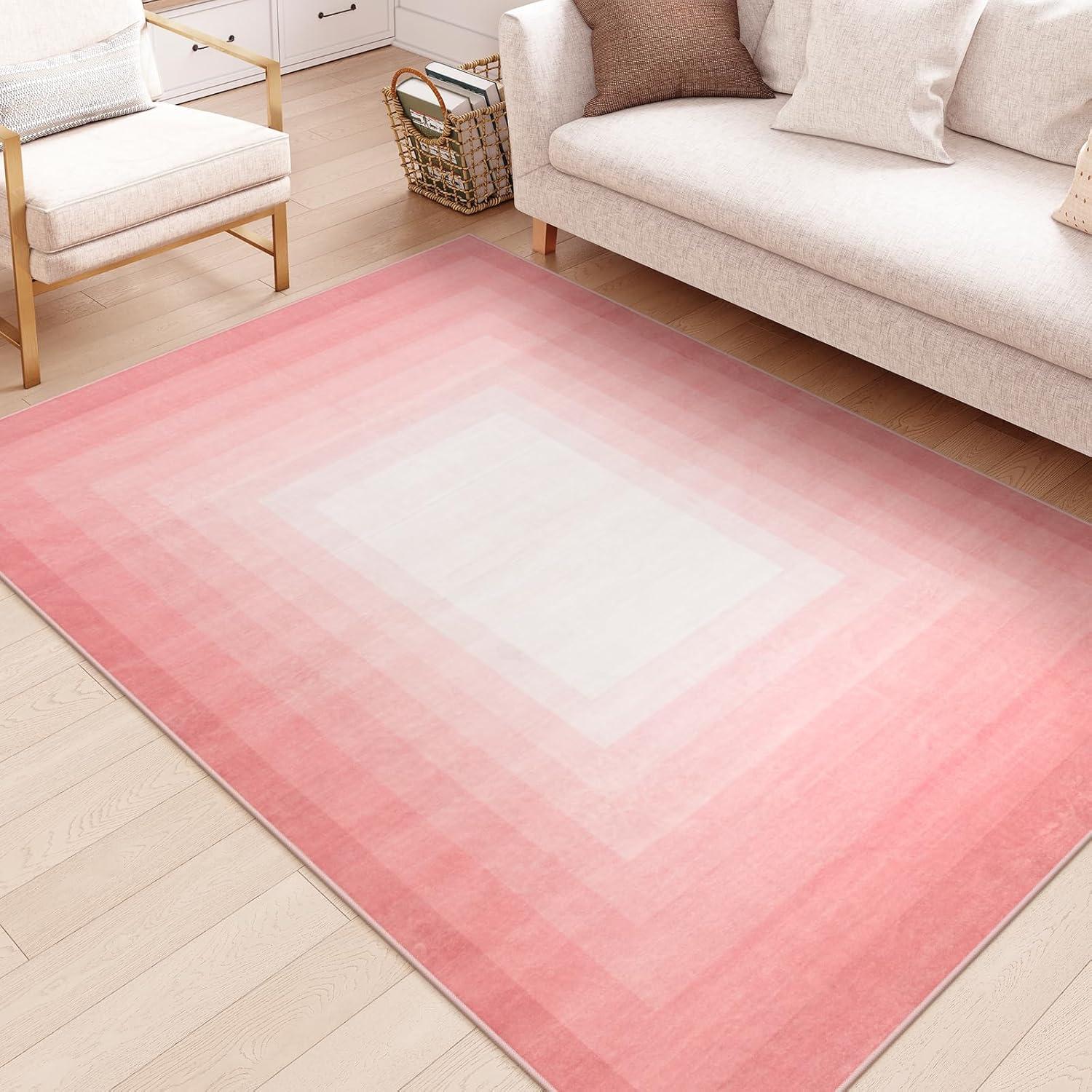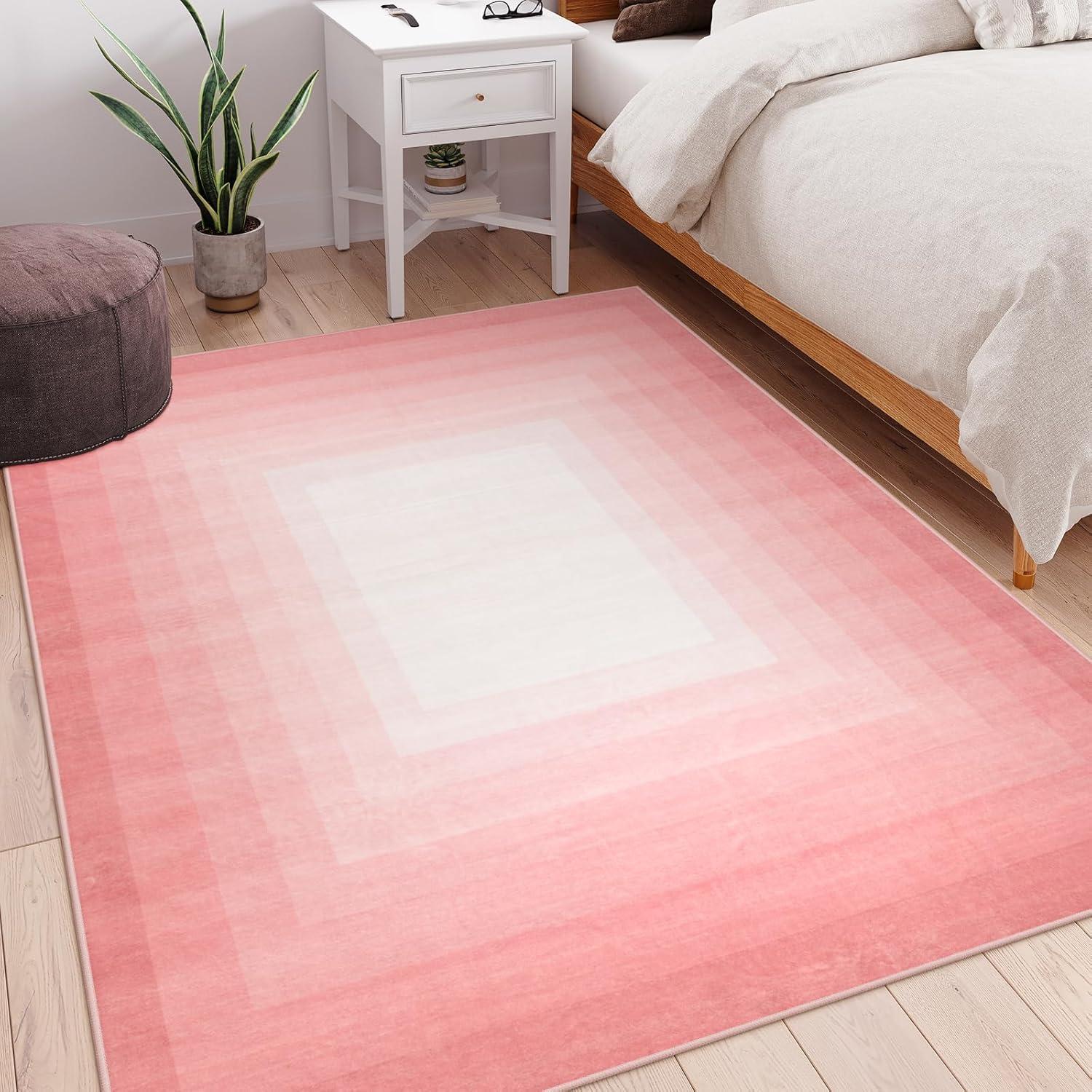 Low-pile design and non-slip backing keep the rug in place and easy to vacuum. | The subtle pink gradient border may not suit every décor theme, leaning towards soft, neutral palettes. |