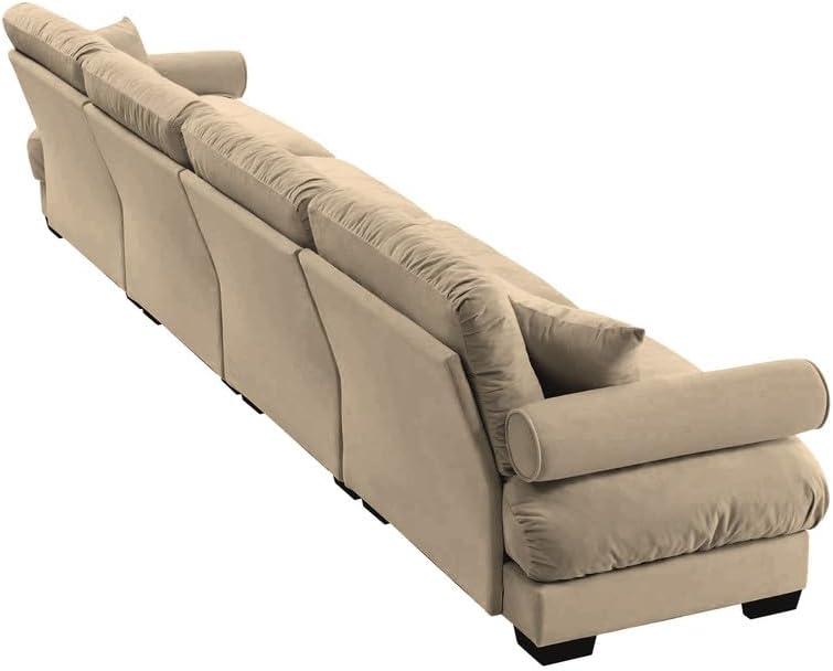 The bolstered armrests are not just stylish features but serve as functional elements that enhance our interaction with the sofa. Their unique round shape and firm filling offer reliable support for arms during conversation or relaxation, and even provide a gentle curve for resting our heads during a midday nap. This design detail transforms the sectional from simply a seating area into a cozy nook ideal for lounging. Plus, the premium velvet fabric adds a soft and durable touch, ensuring that these practical comforts hold up beautifully in everyday family life.