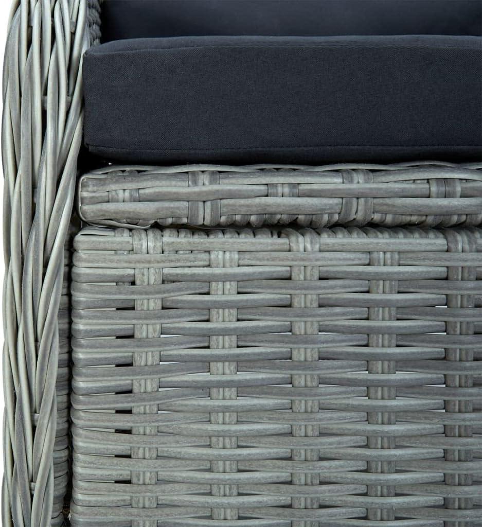 When it arrives and you set it up, the first thing you notice is the overall silhouette sitting on the patio: the chairs tuck neatly under the table, the light gray weave gives a cool, softened backdrop to the darker cushions. Up close the strands of poly rattan show subtle variation where they cross — a faint play of shadow and sheen rather than a flat color. The cushions look plump at a glance; moving your hand along a seam you’ll feel the fabric pull slightly, and you might find yourself smoothing the seat and nudging a back cushion into place without thinking about it.