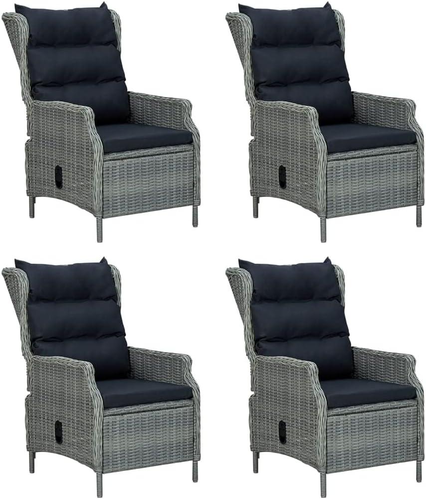 You spot the YAFF 5 Piece Patio Dining Set Light Gray Poly Rattan-6806 on your patio; its pale weave catches the late-afternoon light and reads softer than the surrounding wood. From a few steps away the table presents as a low, honest mass — roughly five feet across — that quietly centers the four chairs without demanding attention. The tempered glass feels cool and mirror-smooth under your palm, while the poly rattan gives a faint, springy texture when you trace the weave. Lift a chair and the powder-coated steel frame proves unexpectedly solid; sit and the black cushions offer a modest, dense pad rather than a plush sink. One backrest reclines with a muted, controlled click, the gas-lift motion so calm you barely notice it until you lean back. As light shifts, the light-gray strands soften the scene while the darker tabletop and cushions add a steady visual weight to the group.