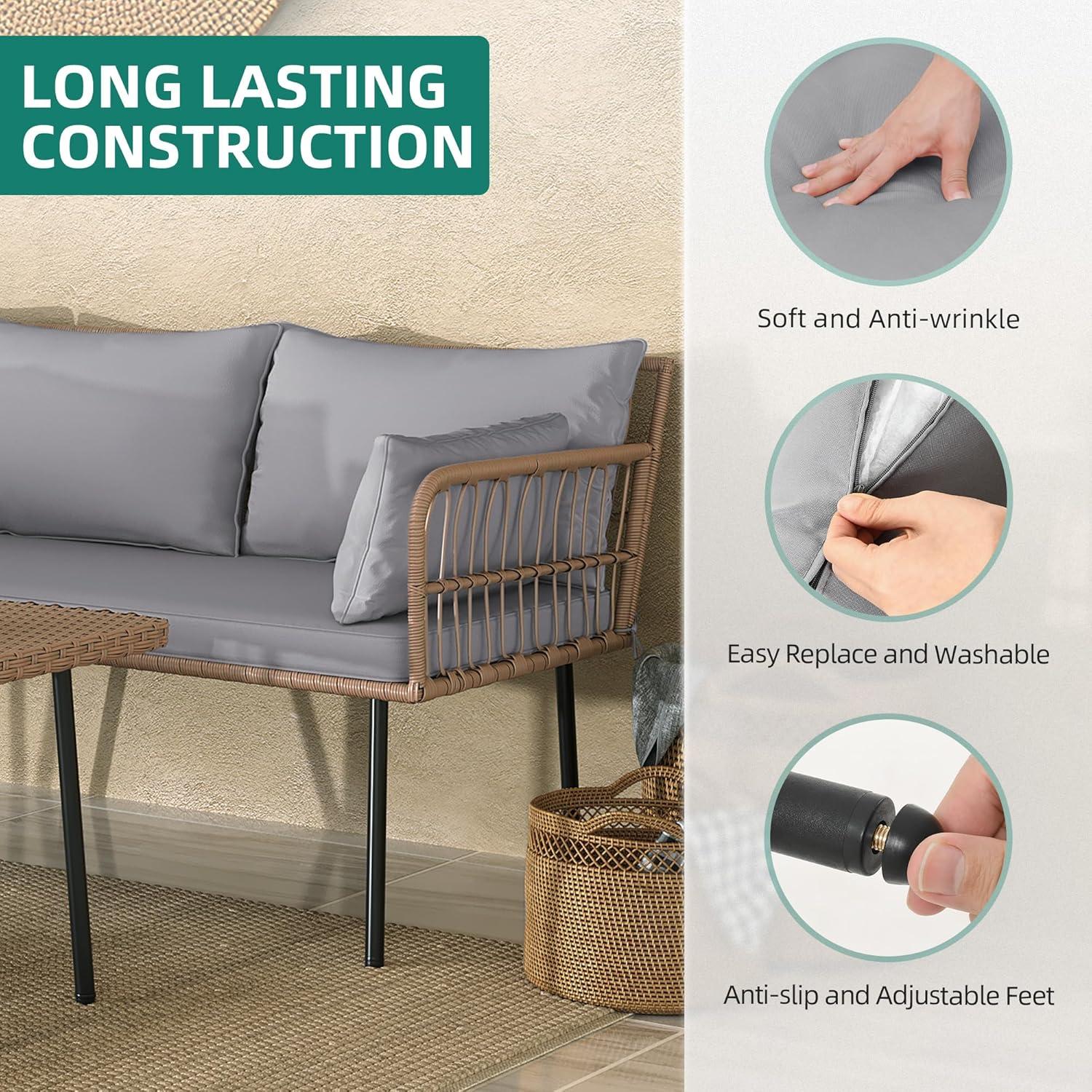 You step out onto the porch and the YITAHOME 4-Piece Wicker Patio Furniture Set rests across the decking, its gray PE rattan weave and low-profile silhouette giving the area an immediate, lived-in calm. Up close the weave feels a touch grainy under your palm and the frame has a reassuring visual weight—solid without being bulky. The cushions yield with a slow, memorable give; thier slightly textured covers catch the late-afternoon light in soft, muted tones.Pieces tuck together into an L-shape that spreads comfortably across the corner, with a low side table keeping a glass and a paperback close at hand. It looks like furniture that’s already part of the day: a little rumpled,quietly ready to be sat in.